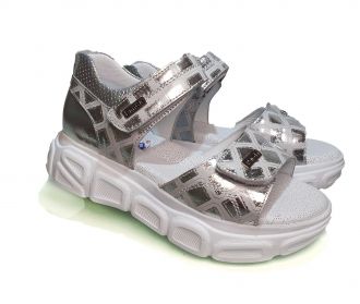 - Верхняя часть босоножек выполнена из качественной светло-серой кожи с геометрическим принтом. Принт придает обуви модный и современный вид, а светло-серый цвет легко сочетается с различными летними нарядами.