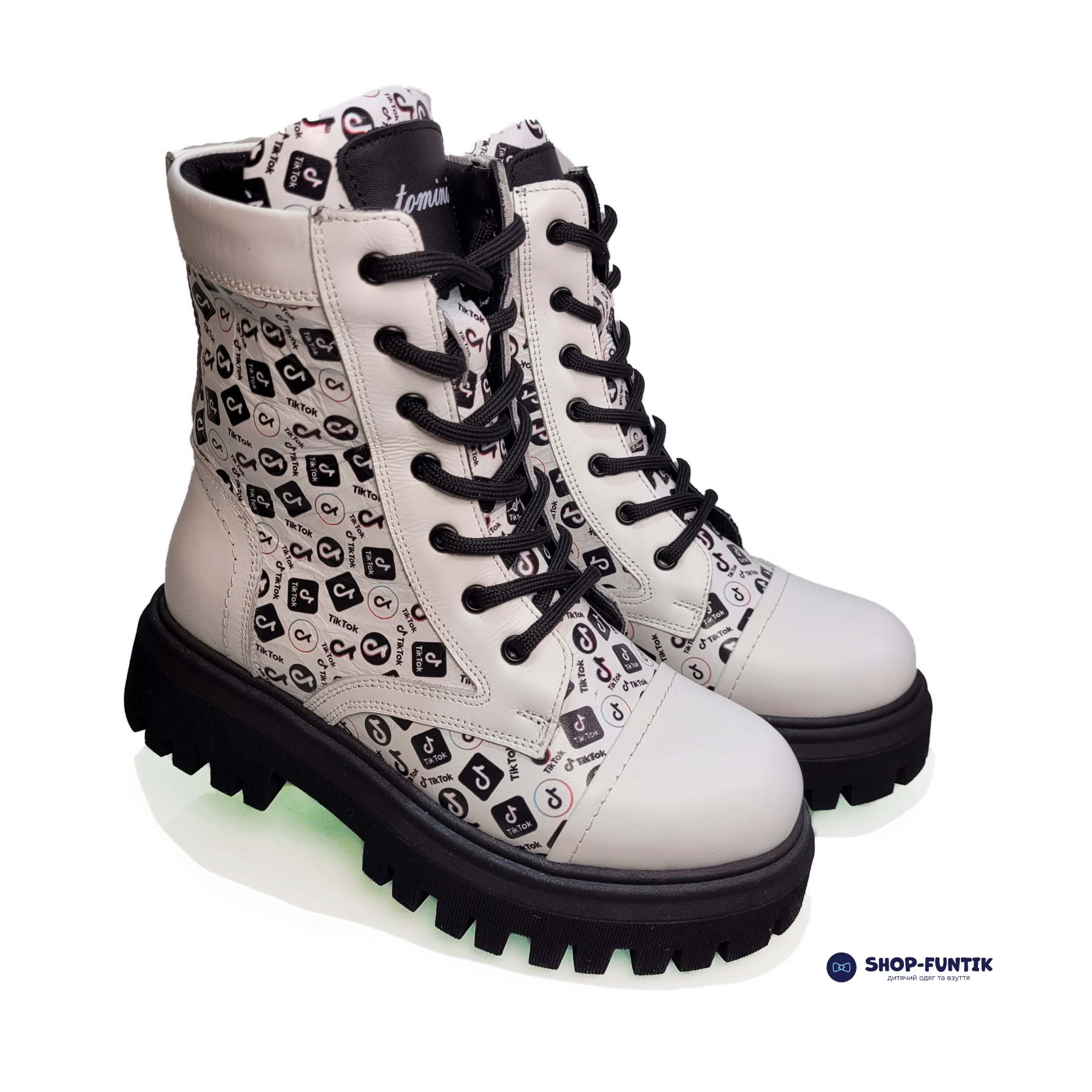 Ботинки Tomini белые с принтом TikTok – отличный вариант зимней обуви для девочек с размером ноги от 31 по 36. Их наверняка выберут поклонники TikTok за стильный белый цвет и оригинальный дизайн. Помимо внешней привлекательности, модель надежно защитит ноги от холода и снега. Сверху обувь сделана из кожи, внутри находится теплая подкладка из эко меха.