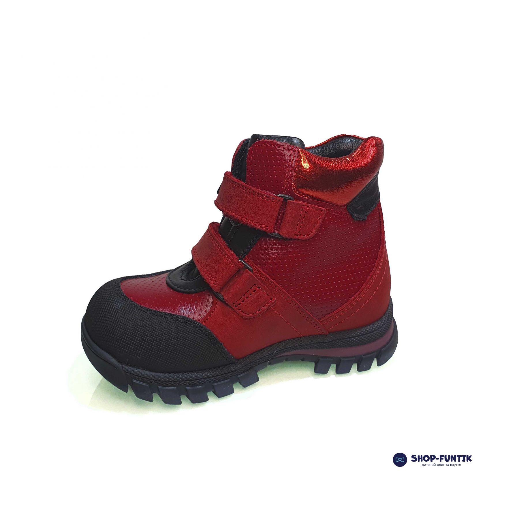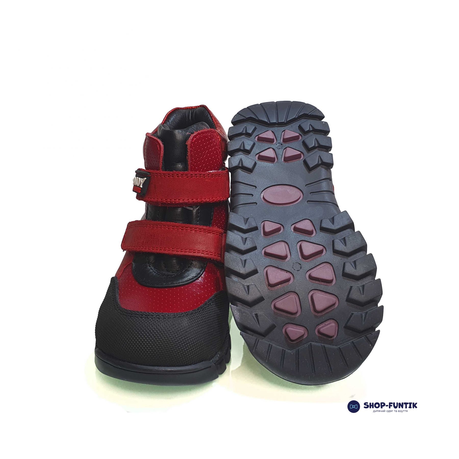 Верх: Изготовлен из натуральной кожи, что обеспечивает долговечность и защиту от внешних воздействий. Ярко-красный цвет добавляет обуви стильности и делает её заметной, что понравится как детям, так и родителям.