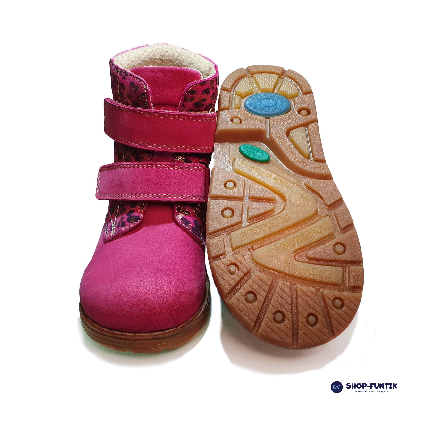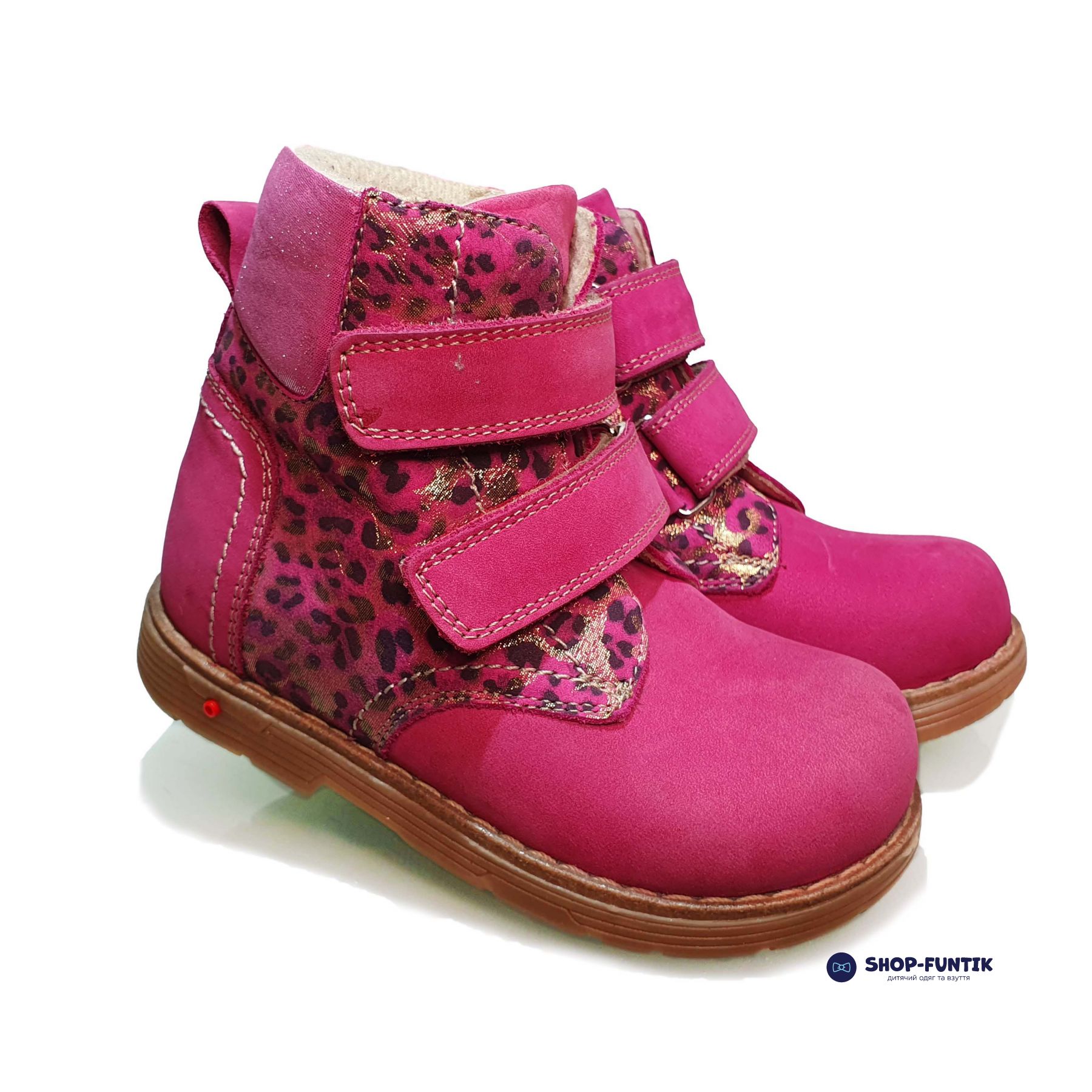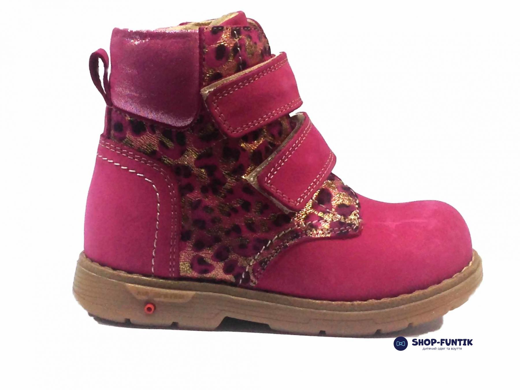 Верх ботинок выполнен из натурального нубука, который придаёт обуви мягкость и долговечность, а также обладает хорошими дышащими свойствами. Розовый цвет ботинок делает их яркими и привлекательными, а кожаная вставка с анималистическим принтом добавляет оригинальности и выделяет эту модель среди других. Этот стильный акцент подчёркивает индивидуальность и привносит элемент моды в детский гардероб.