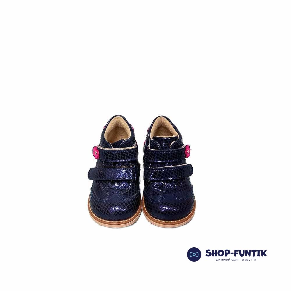 Верх ботинок выполнен из натуральной кожи, что обеспечивает прочность и долговечность обуви. Темно-синий цвет придаёт ботинкам элегантный и универсальный вид, а розовый цветочек, нашитый на внешней стороне, добавляет модели нежности и делает её более яркой и привлекательной.