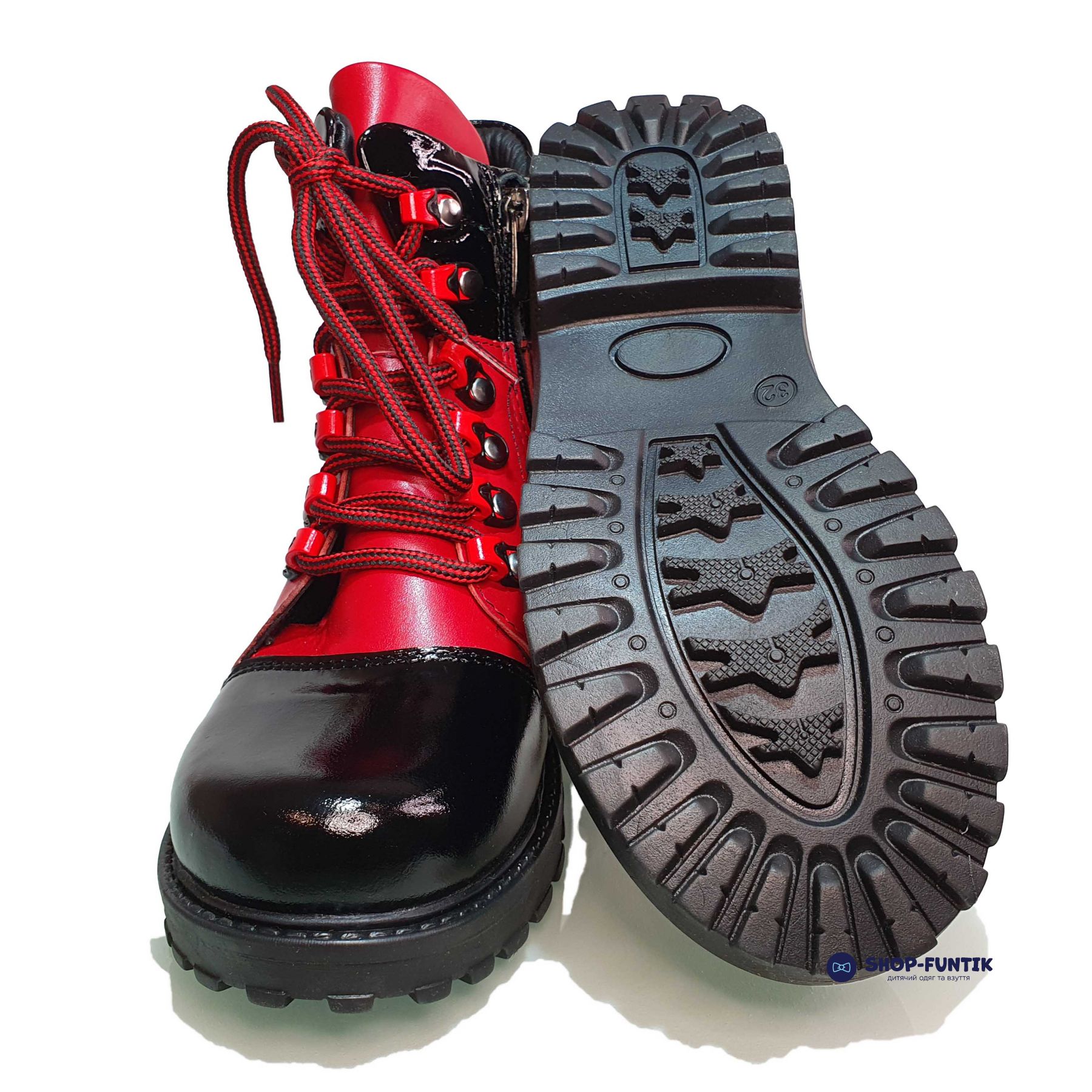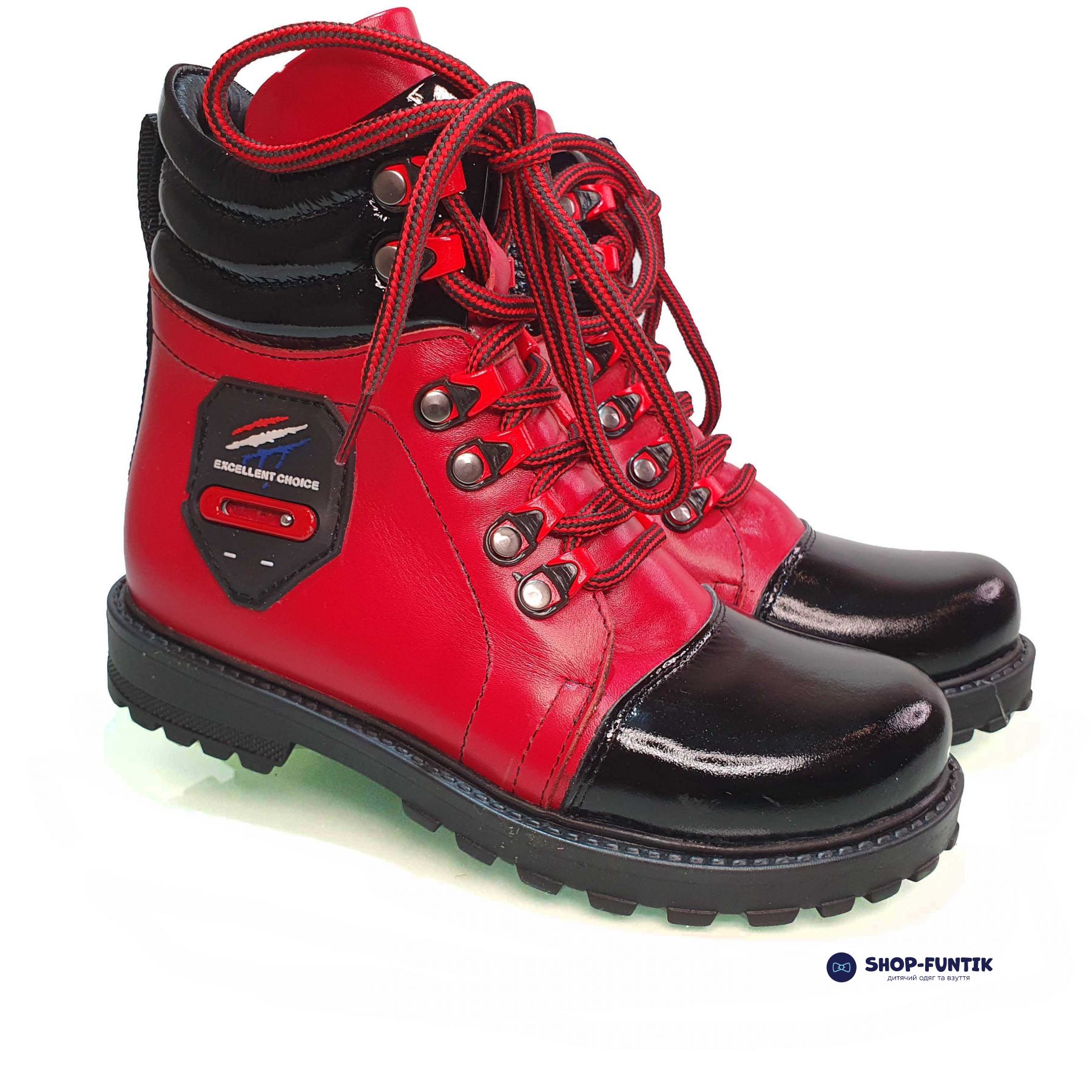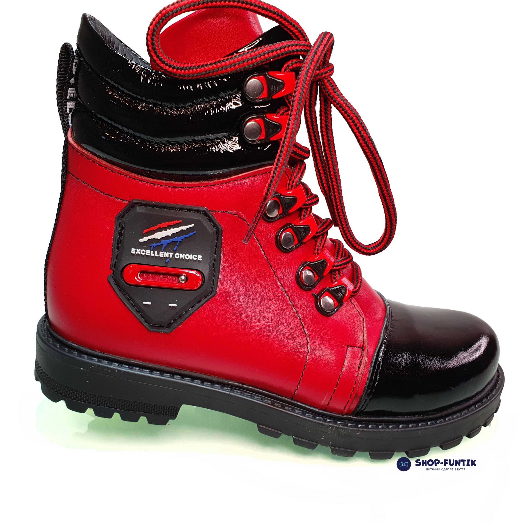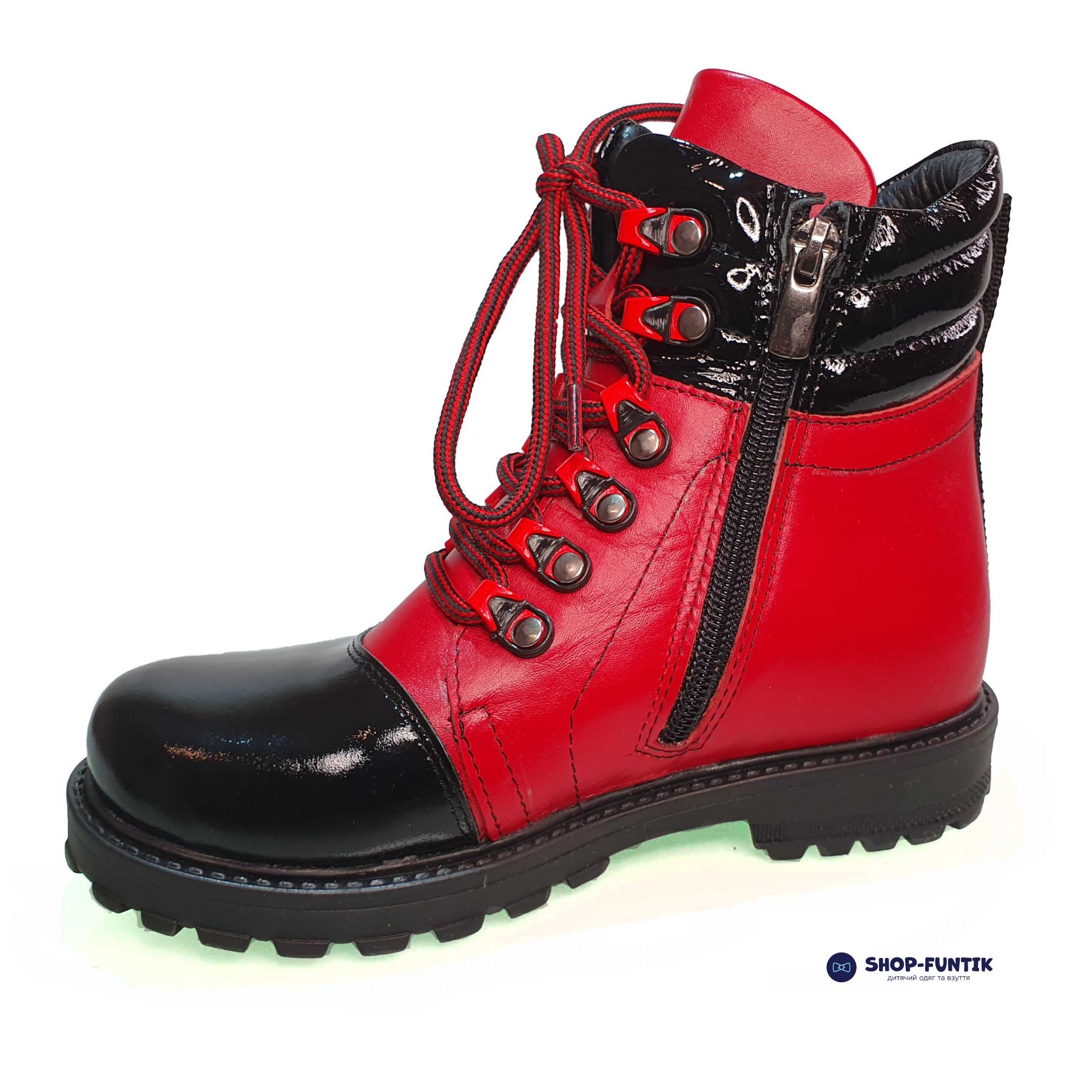 - Верх обуви: Верхняя часть ботинок выполнена из качественной натуральной кожи. Черные кожаные элементы располагаются на носке и верхней части ботинок, что придает им особый шарм и защищает наиболее подверженные износу участки. Основная часть ботинок окрашена в яркий красный цвет, что делает их заметными и привлекательными.
