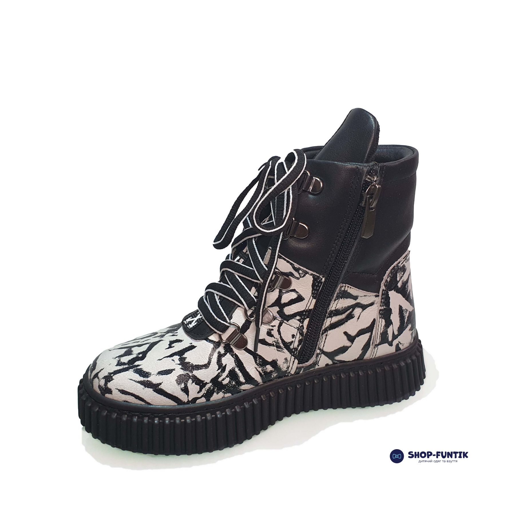 Ботинки Panda с черно-белым принтом однозначно привлекут внимание модниц школьного возраста. Турецкому производителю удалось создать интересный рисунок, соединив два классических цвета, благодаря чему получилась нарядная демисезонная обувь. Ботинки имеют среднюю высоту. Верх модели выполнен из кожи, подкладка текстильная, поэтому ногам не будет холодно.