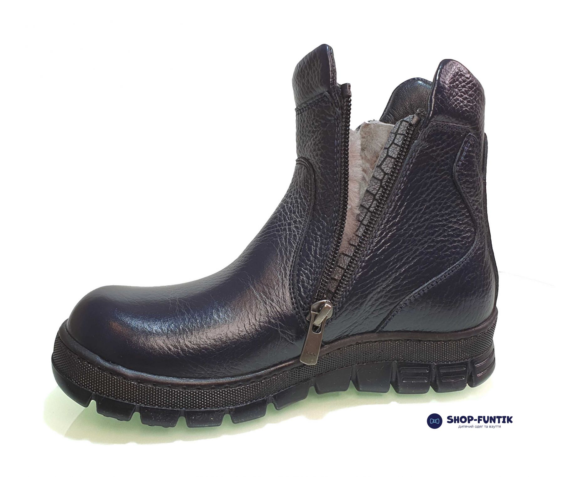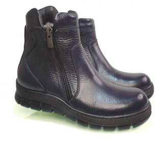 Зимние ботинки для мальчиков выполнены из кожи классического темно-синего (почти черного) цвета.
