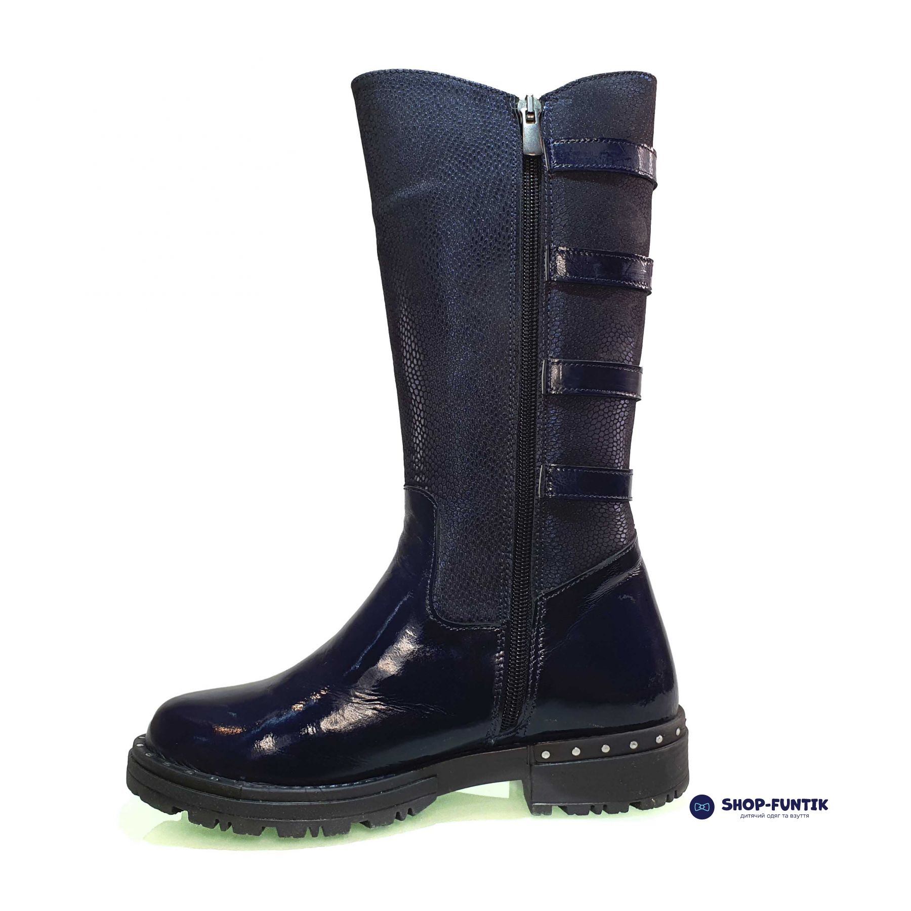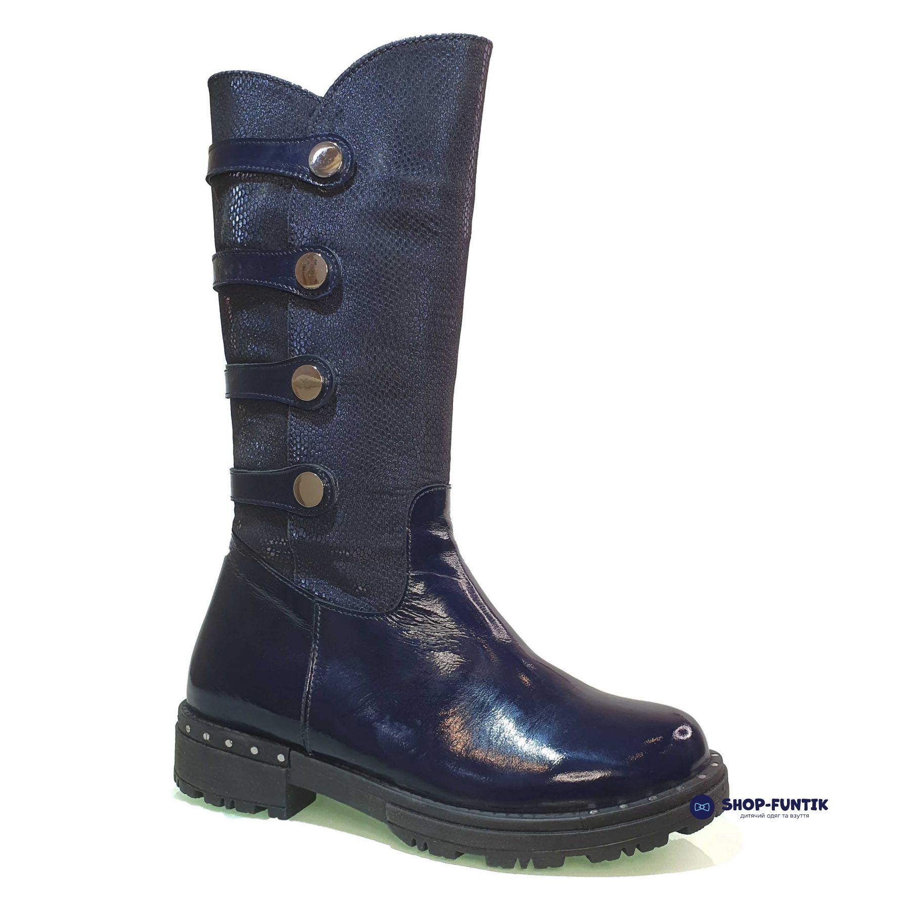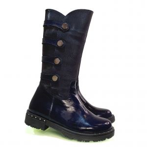 Представляем зимние сапоги Panda для девочек – идеальное сочетание стиля и комфорта, которое обязательно порадует вашу маленькую модницу. Эти сапоги выполнены из лакированной кожи глубокого синего цвета с элегантной текстурой под змеиную кожу, что придает им особую привлекательность и шик.