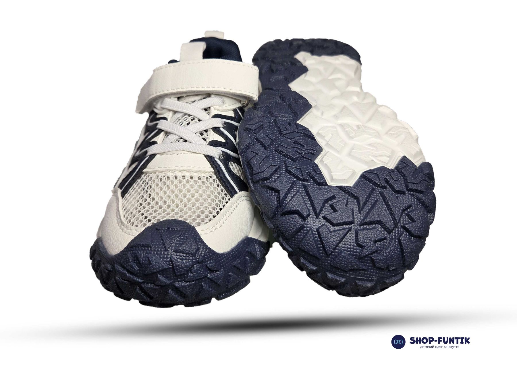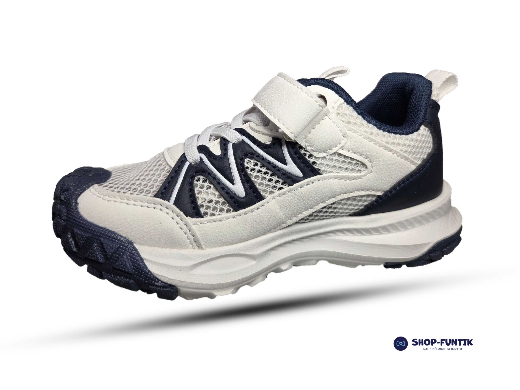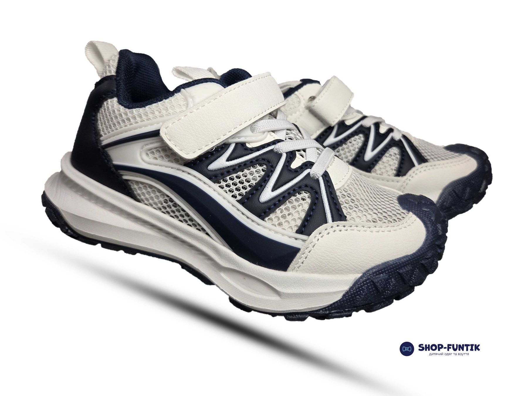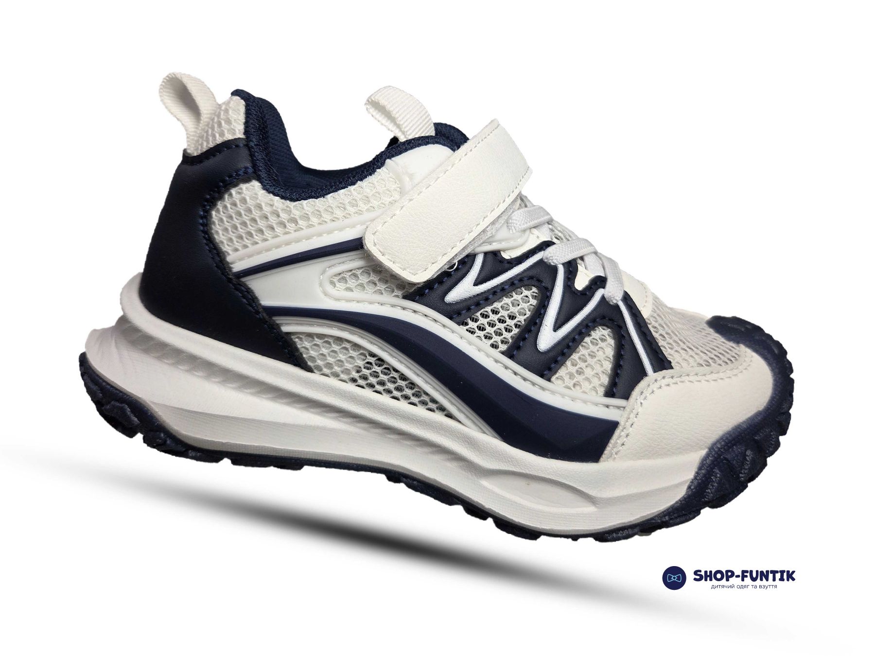 Модель выполнена в универсальной бело синей цветовой гамме, которая легко сочетается с любой повседневной одеждой. Подошва – легкая, рельефная, с амортизирующим эффектом, хорошо держит сцепление с поверхностью и обеспечивает устойчивость даже при активных играх. Застежка на липучке и резиновые шнурки позволяют быстро надевать и снимать кроссовки без помощи взрослых.