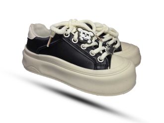 Массивная подошва обеспечивает отличную амортизацию и защиту стопы, а контрастные белые шнурки и металлические люверсы придают кроссовкам оригинальный и современный вид. Черно-белое цветовое решение делает эту модель универсальной — она легко сочетается с джинсами, спортивными штанами и повседневной одеждой.