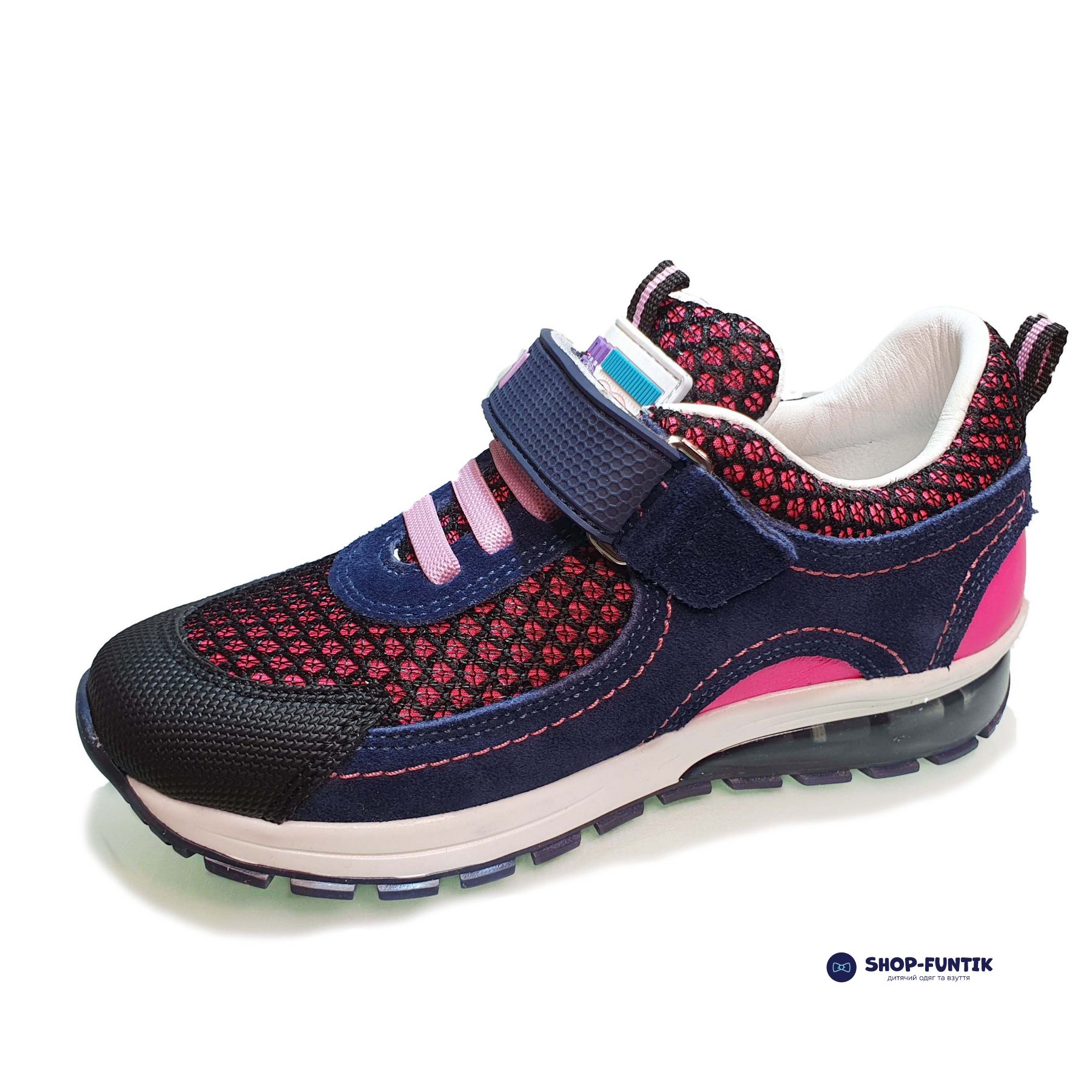 Верх кроссовок выполнен из комбинации нубука и сетки, что обеспечивает отличную вентиляцию и долговечность. Защищенный носок добавляет прочности и защищает обувь от повреждений, что особенно важно для активных детей. Сочетание синего и розового цветов создает яркий и стильный образ, который обязательно понравится девочкам.