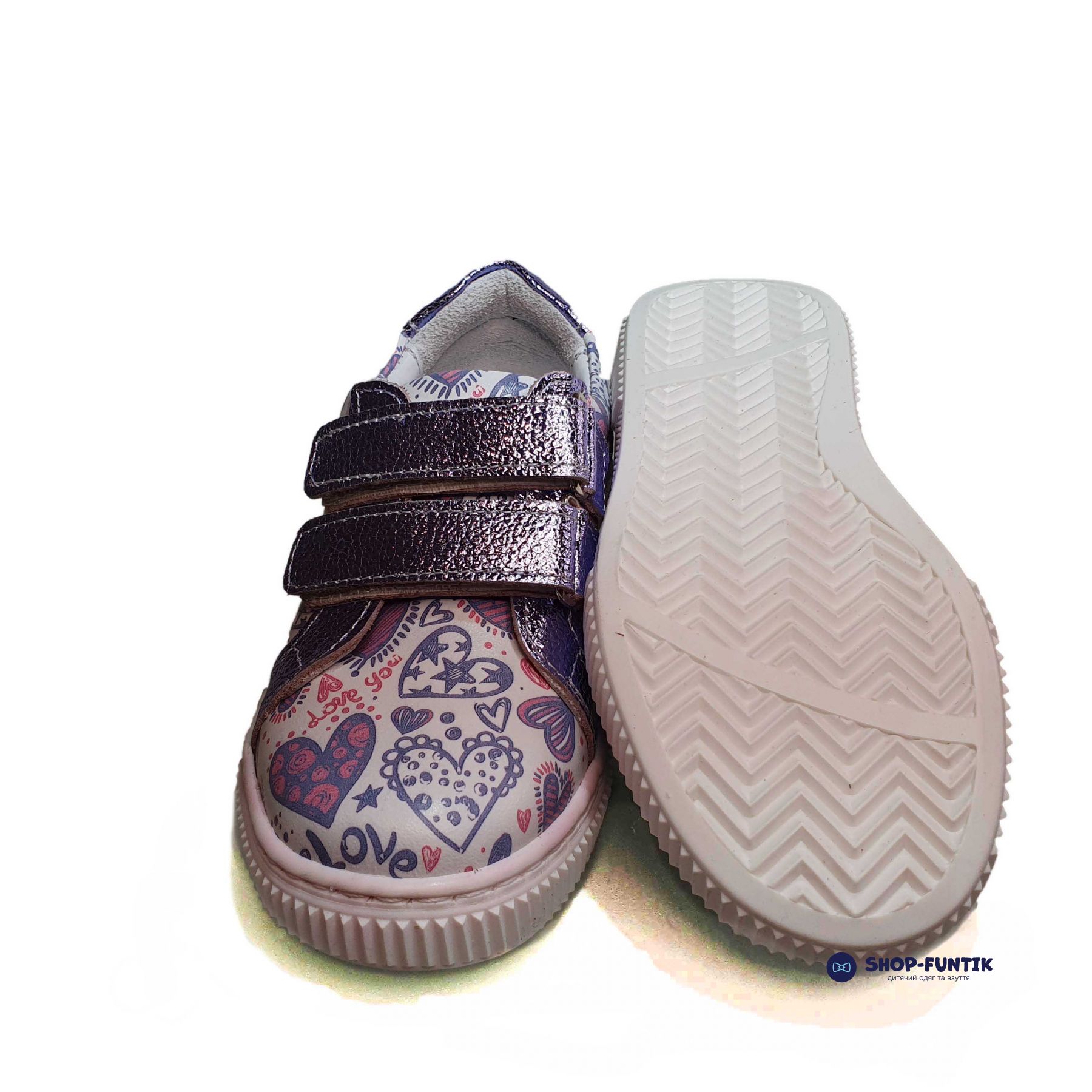 Внутренняя часть также отделана кожей, что обеспечивает комфорт при длительном ношении и поддерживает здоровый микроклимат для ножек. Задник усилен сиреневой кожаной накладкой, которая не только добавляет прочности обуви, но и гармонично сочетается с остальными элементами дизайна. Две липучки сиреневого цвета обеспечивают надёжную фиксацию, благодаря чему кроссовки легко надевать и снимать, а также они прекрасно сидят на ноге.