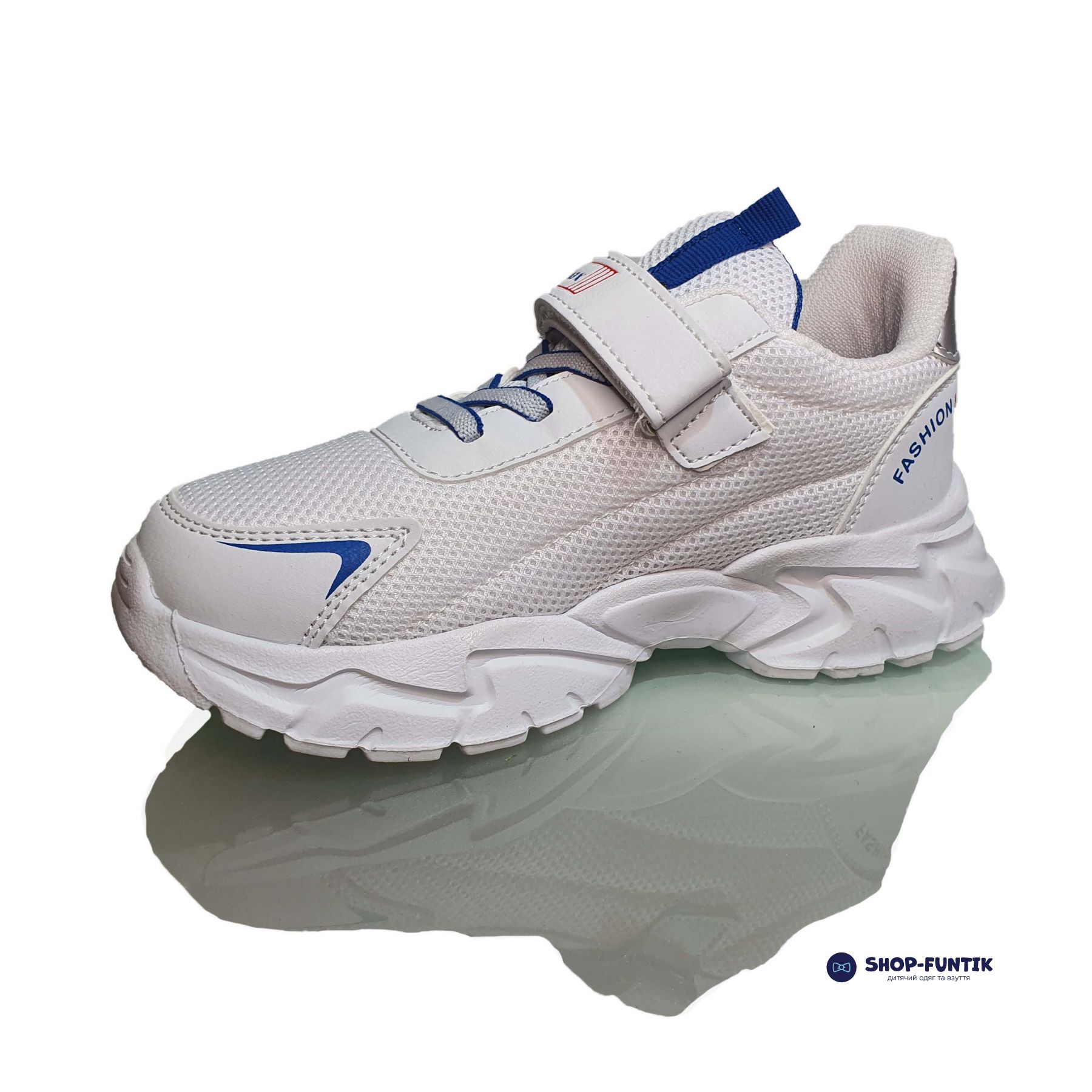 Подростковая летняя обувь белого цвета с яркими синими и красными вставками. Застегивается на липучке, надежно фиксирует ногу.