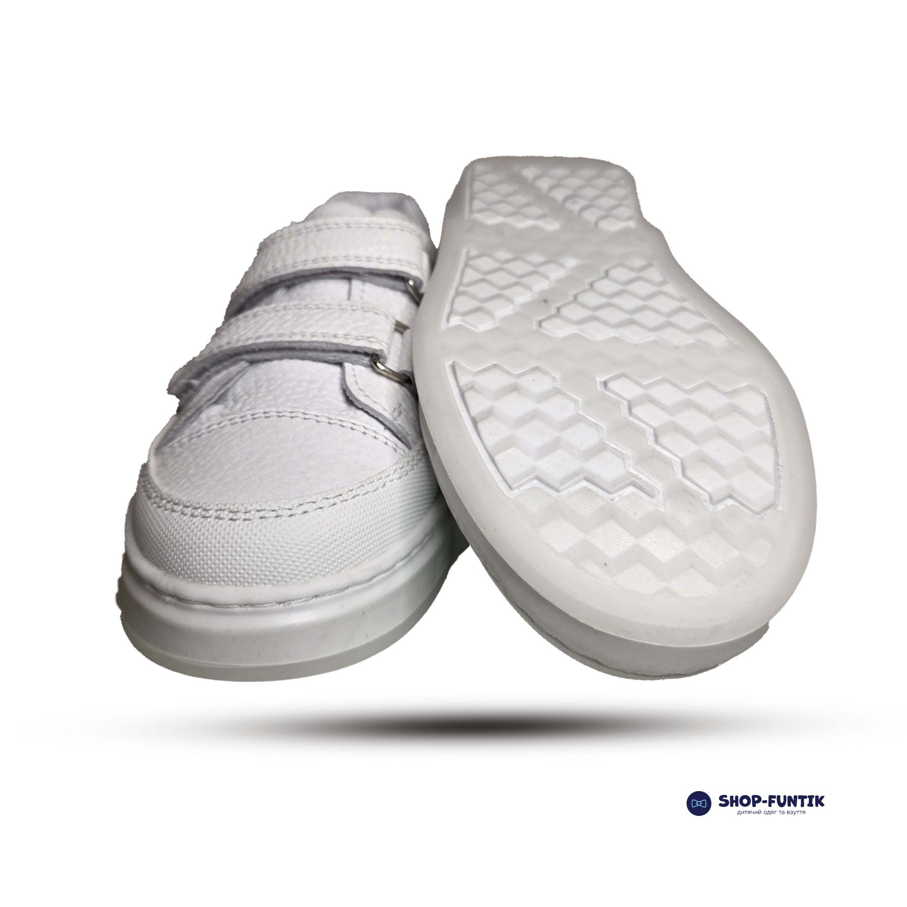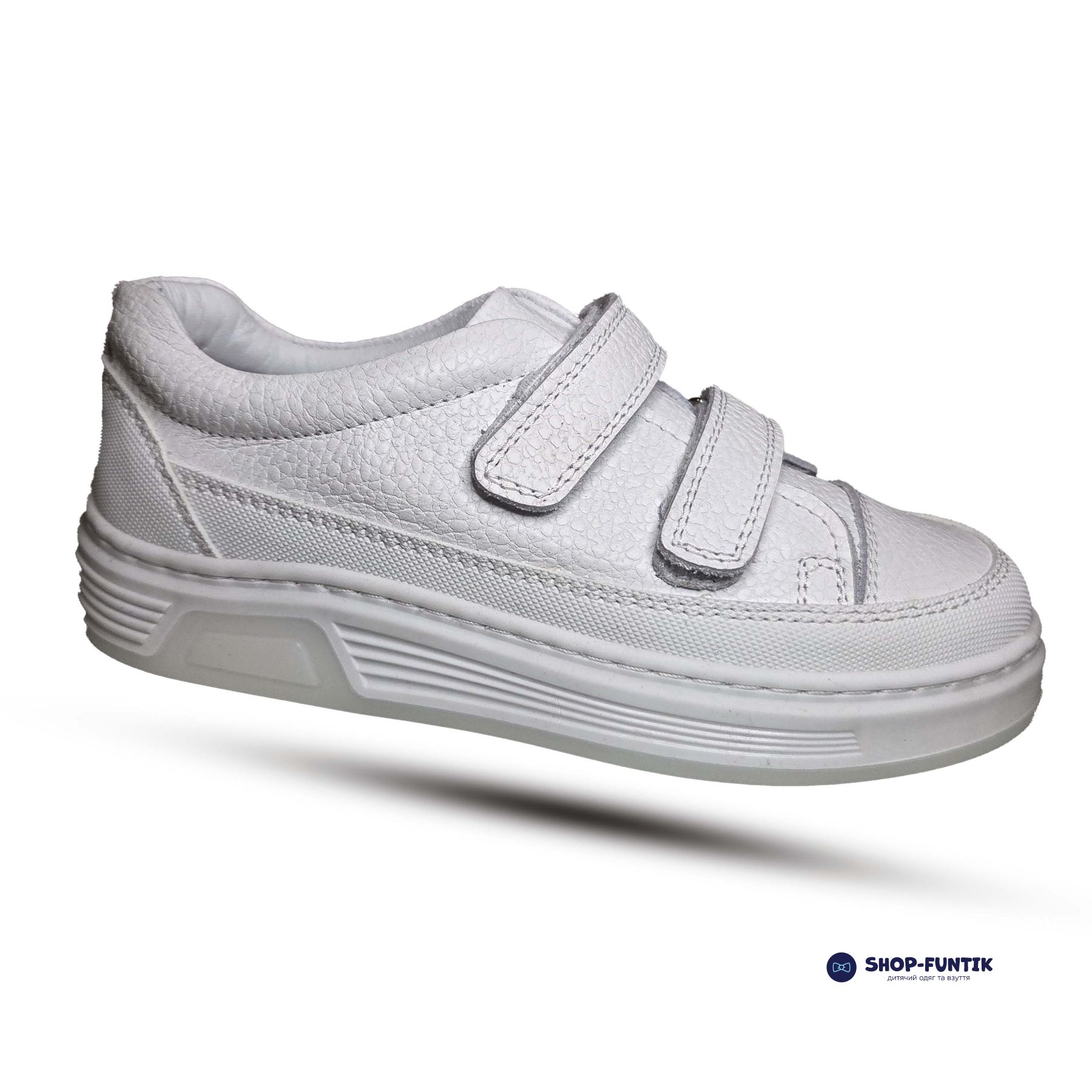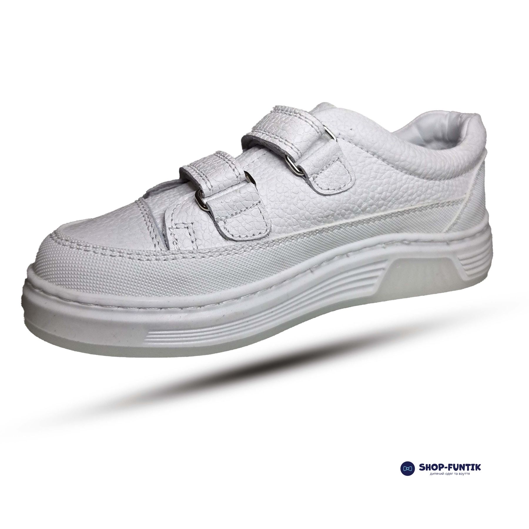 Внутренняя часть изготовлена из мягкой белой натуральной кожи, которая создает комфортный микроклимат внутри обуви, предотвращает натирание и позволяет ножке дышать. Это делает кроссовки удобными даже при длительных прогулках и активных играх.