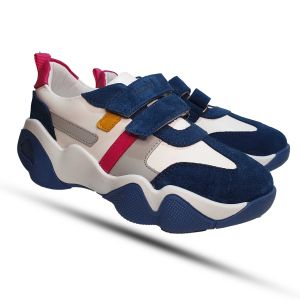 Кроссовки выполнены из натуральной кожи высокого качества, что гарантирует долговечность и стильный внешний вид. Бело и синяя расцветка модели придаёт ей свежий и динамичный вид, а аппликации с серыми, красными и жёлтыми полосками добавляют ярких акцентов, делая обувь привлекательной для детей.