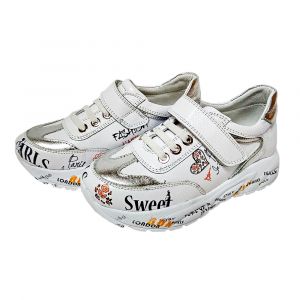 анатомии человека. Детская обувь выполнена в белом цвете с серебристой наклейкой на носке и