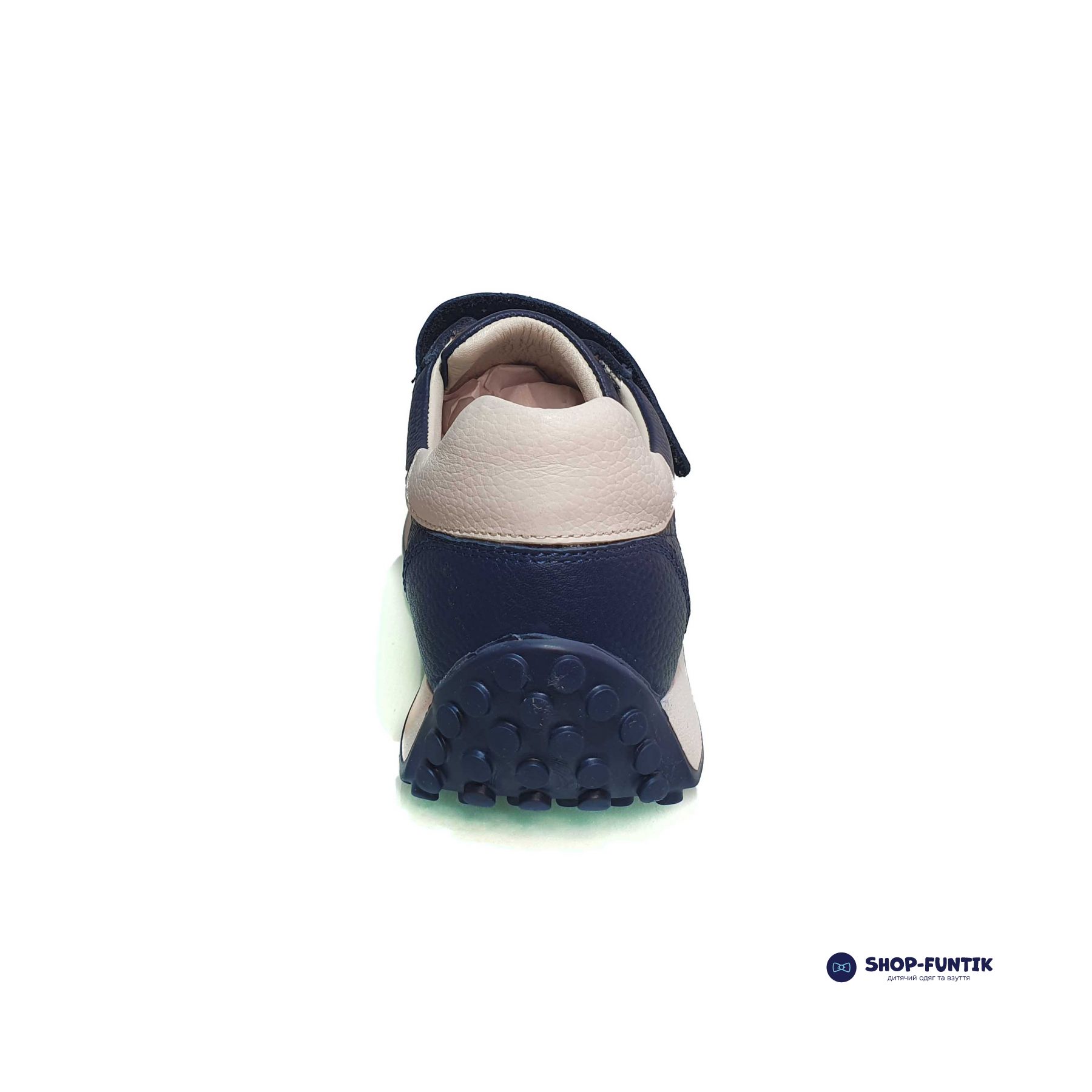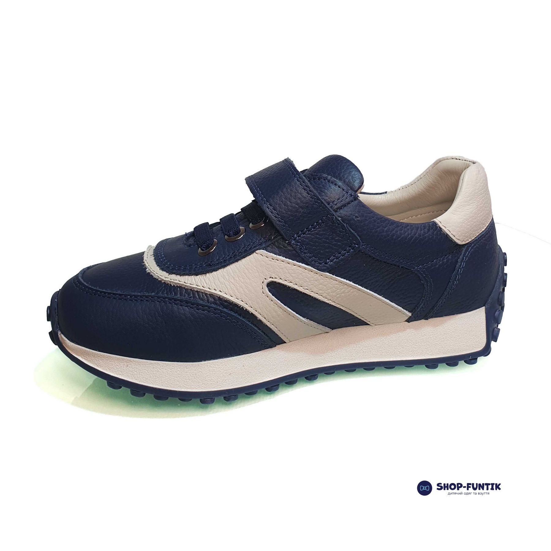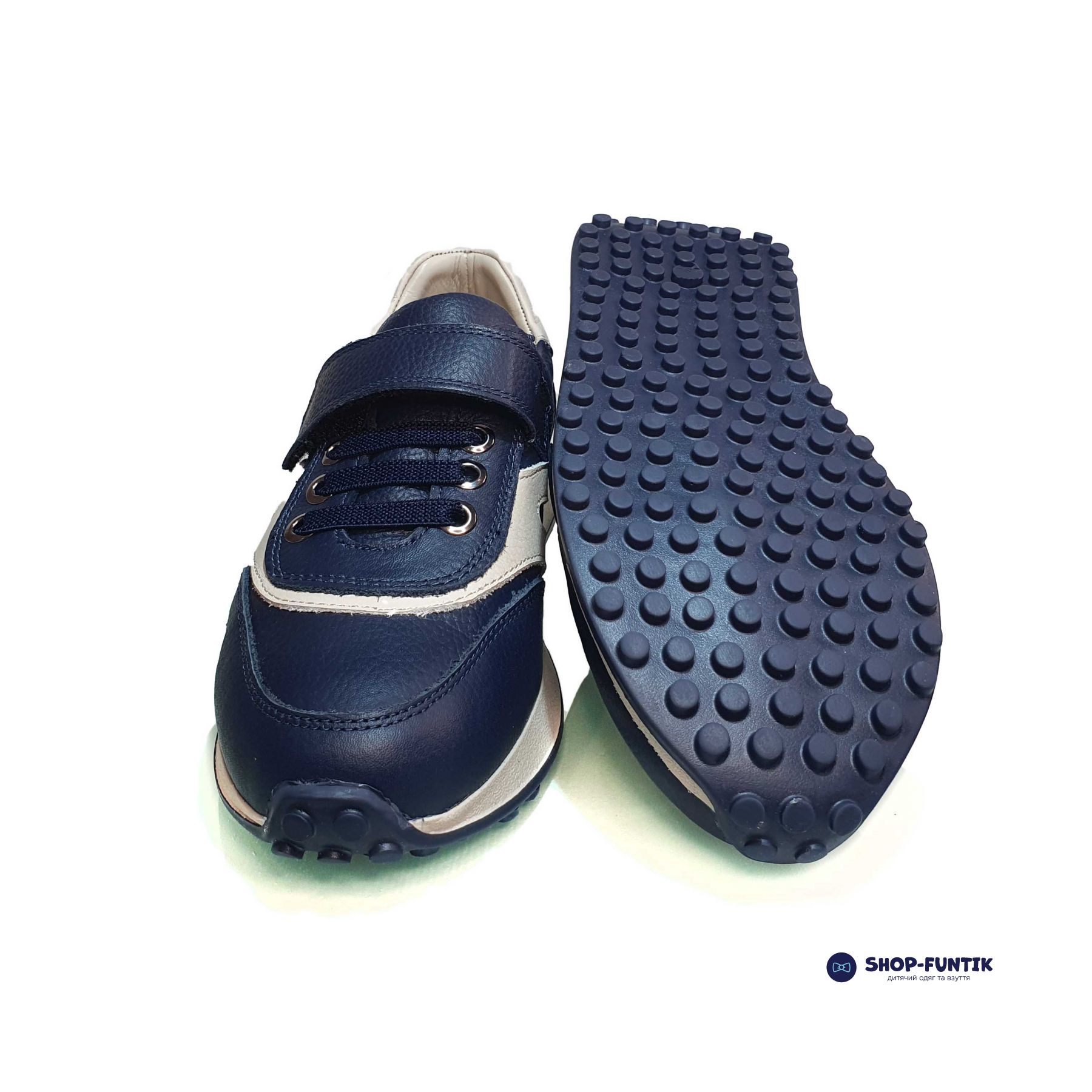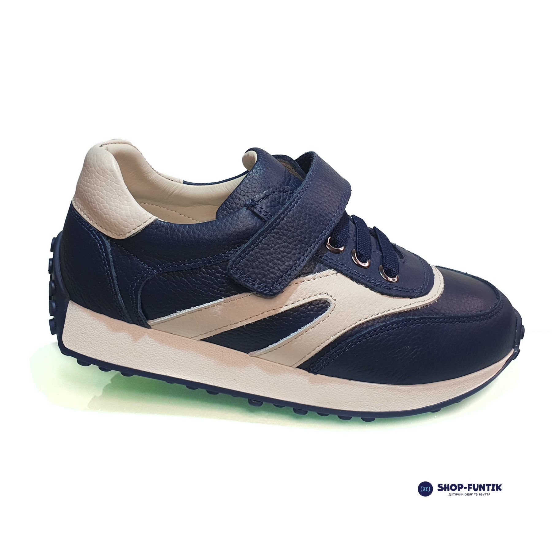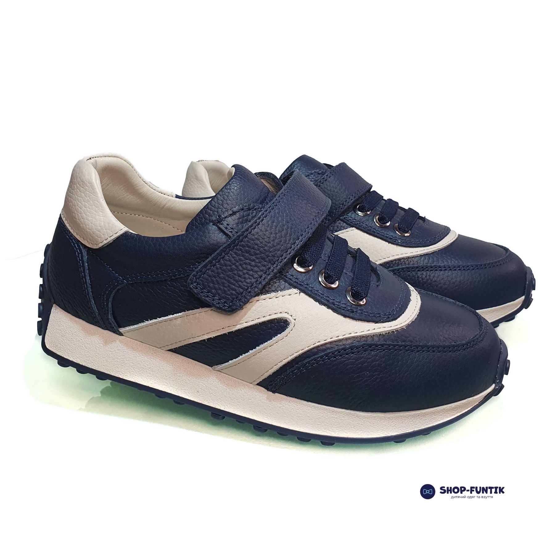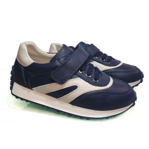 Верх кроссовок выполнен из прочной кожи синего цвета, украшенной элегантными белыми вставками. Такая комбинация делает обувь не только модной, но и универсальной, подходящей к любому гардеробу. Декоративная шнуровка добавляет стильный акцент, при этом застежка-липучка обеспечивает лёгкость и удобство надевания. Ваш ребёнок сможет быстро и самостоятельно надевать и снимать обувь, что особенно важно для активных и самостоятельных малышей.