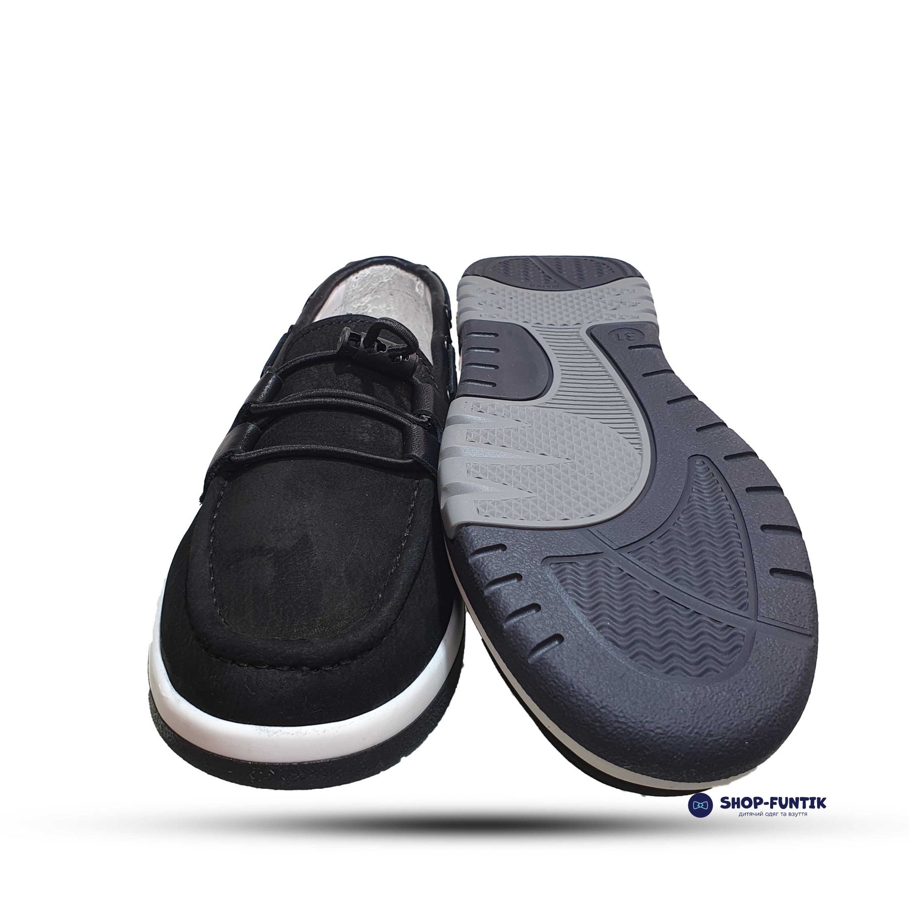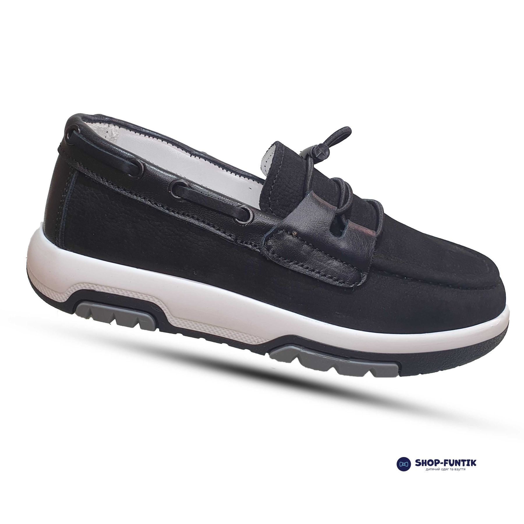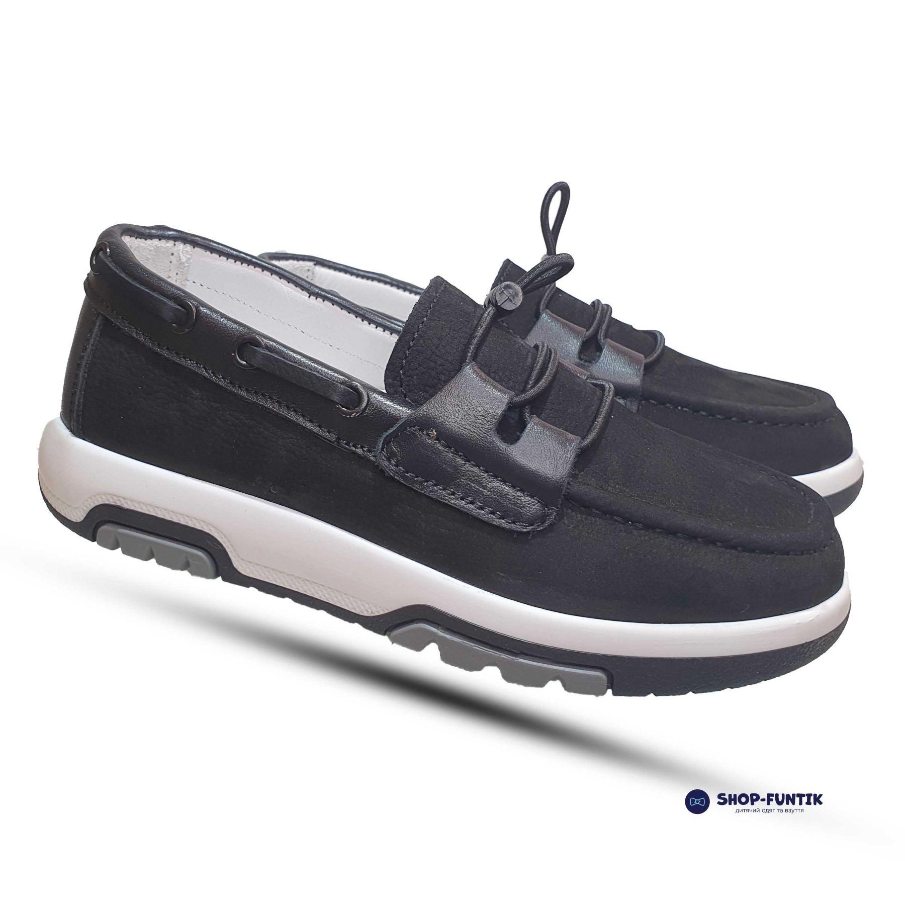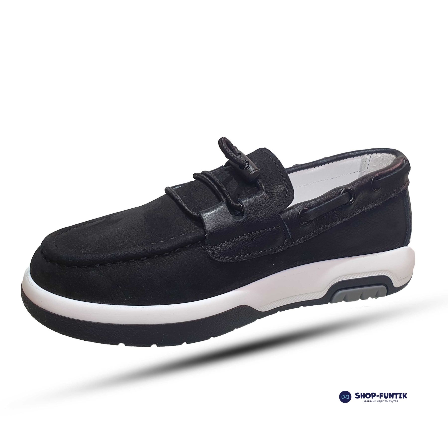 Идеально подходящие для школы и ежедневного использования, эти демисезонные мокасины предлагают комфорт и стиль. Верх обуви выполнен из качественного нубука с кожаными вставками, что придает модели элегантный вид и делает её практичной в носке. Черный цвет с декоративной резинкой добавляет изысканности, а комбинированная белая подошва с черным основанием создаёт современный контраст.