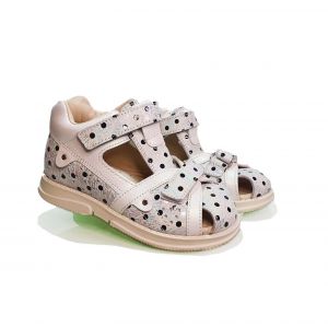 Сандалии для девочки сделаны из натуральной кожи. Подкладка стандартного телесного цвета, верх бежевый с черными точками. Застежка двойная, на липучке. С одной стороны, фиксирует щиколотку, а с другой стороны застегивается на пальцах. Таким образом, летняя обувь является универсальной и подходит детям с разным типом ноги. Её легко надевать и снимать, но самые маленькие дети не смогут случайно сделать это самостоятельно. Летние сандалии полузакрытые, имеют декоративные отверстия с двух сторон. Подошва изготовлена из поливинилхлорида (винила), поэтому она достаточно гибкая, удобная в повседневной носке.