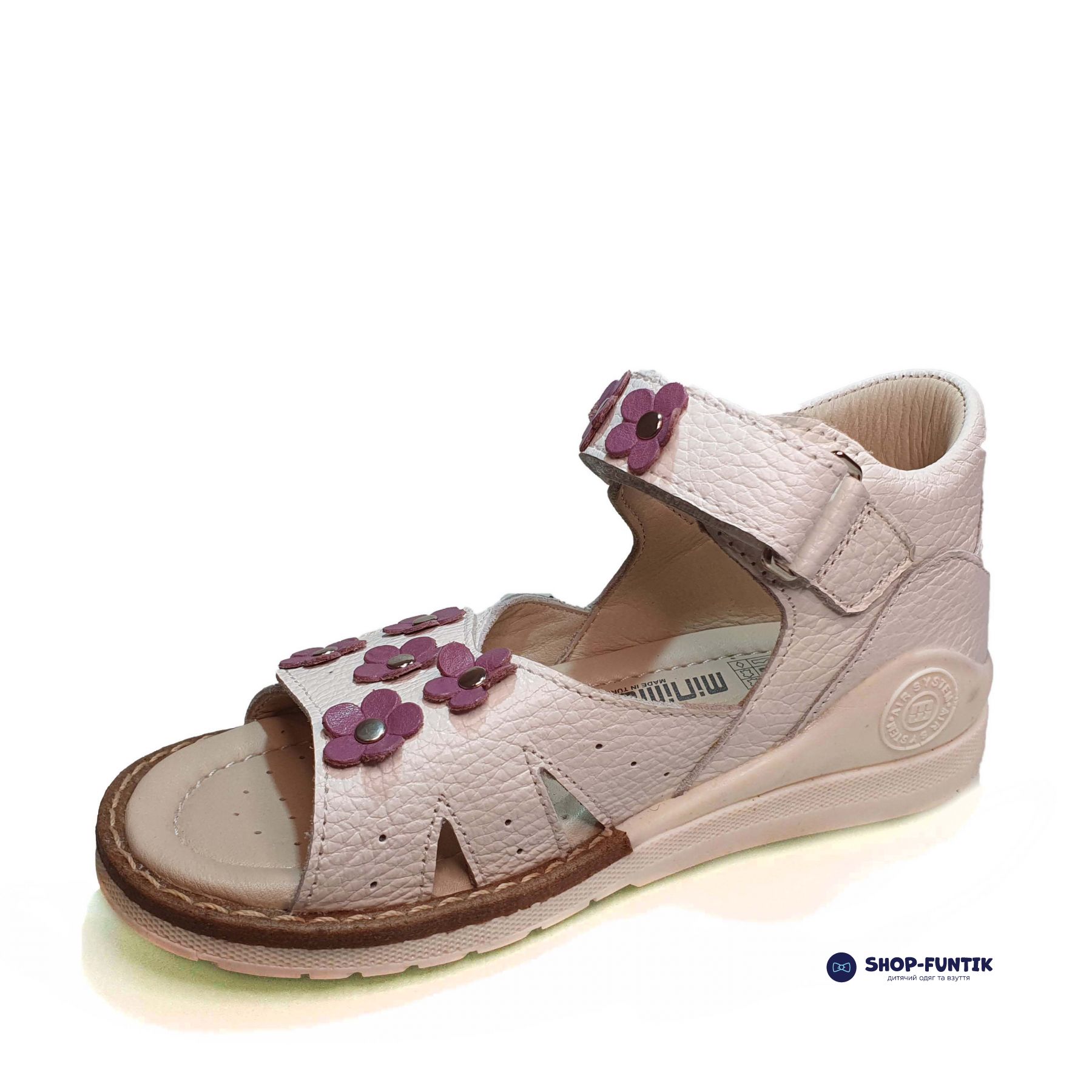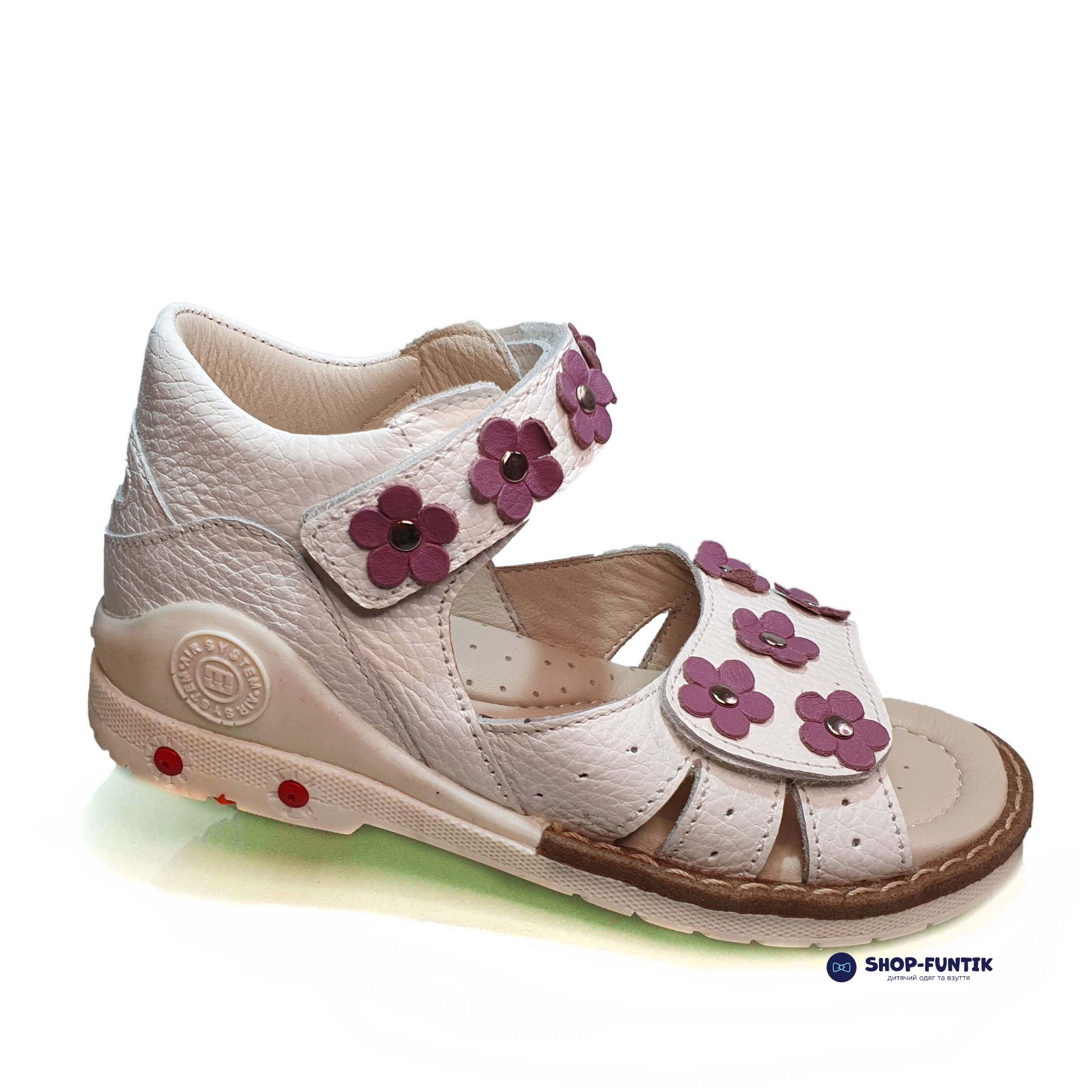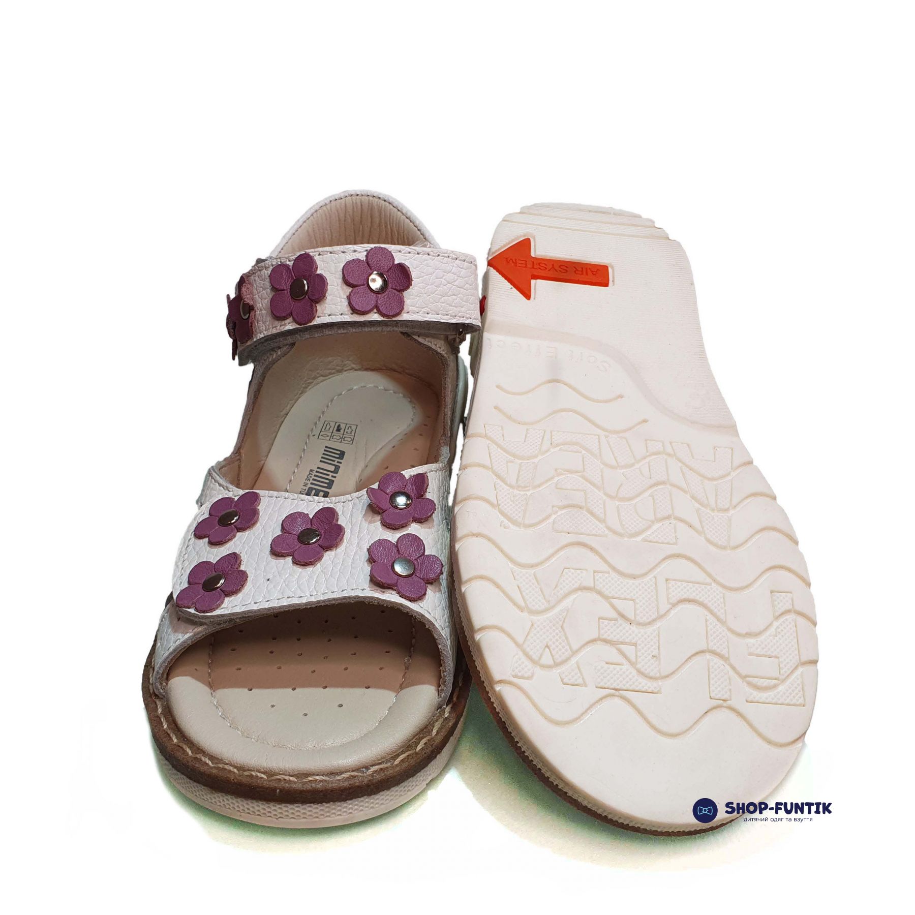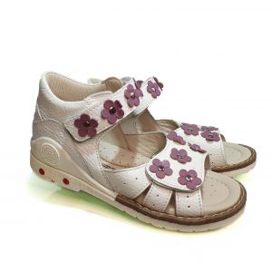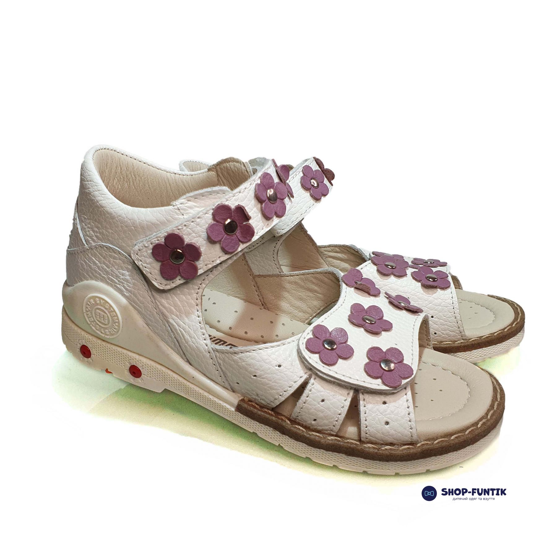 Верх сандалий выполнен из качественной белой кожи, которая придает обуви свежий и нарядный вид. Верх украшен аппликацией фиолетового цвета в виде цветочков, что добавляет нежности и оригинальности дизайну, делая сандалии привлекательными для девочек.