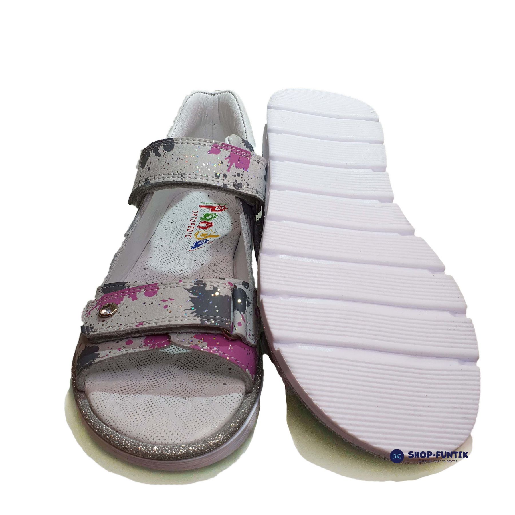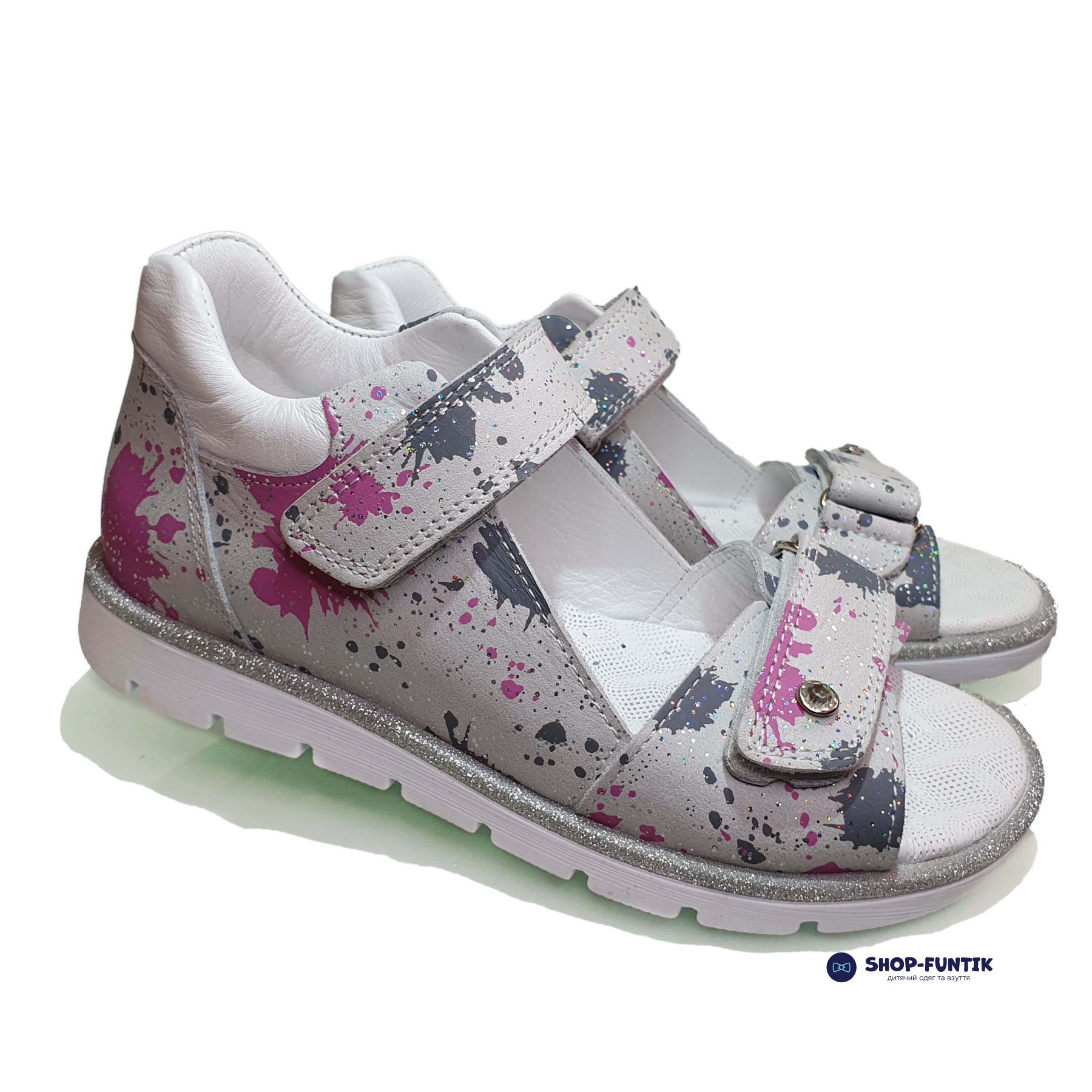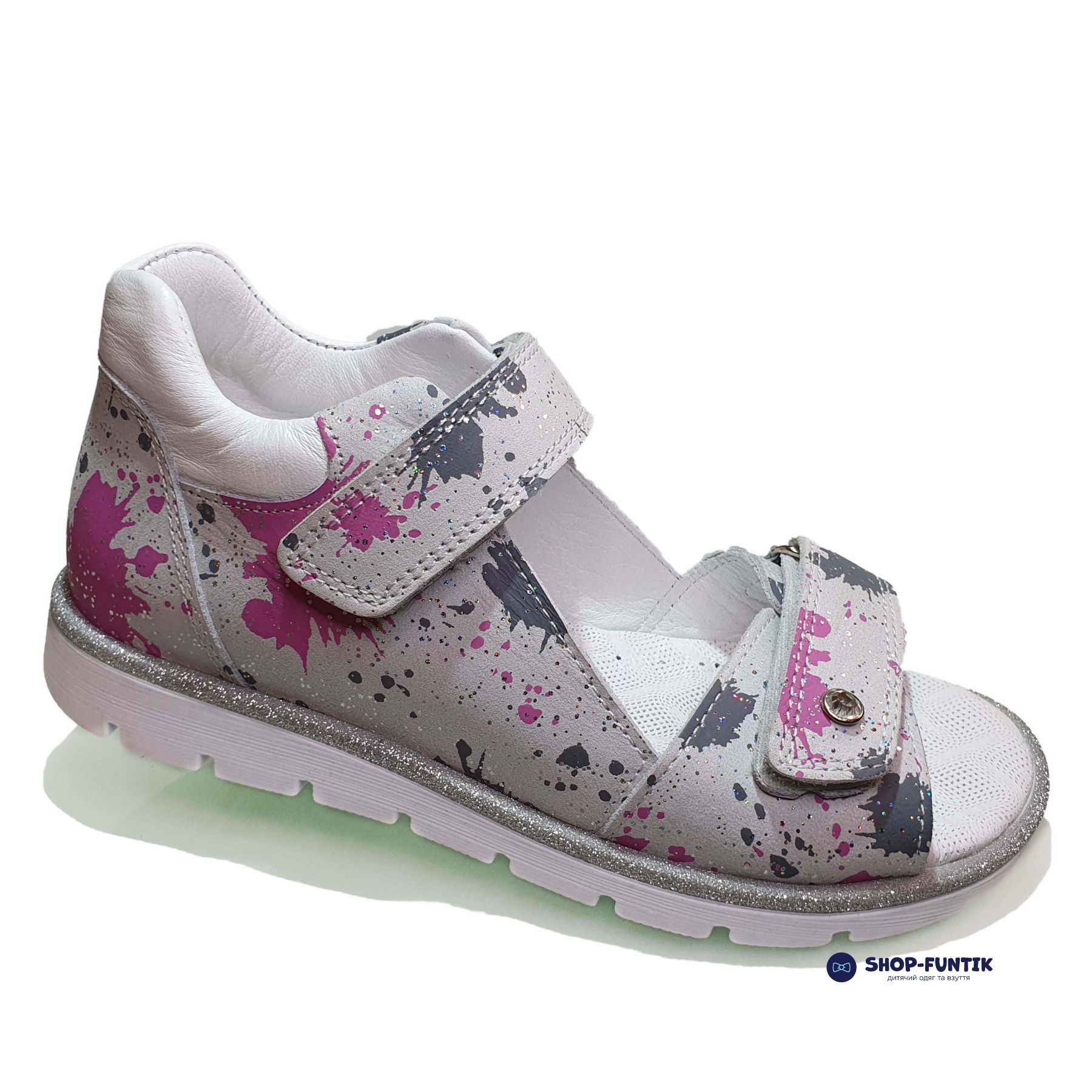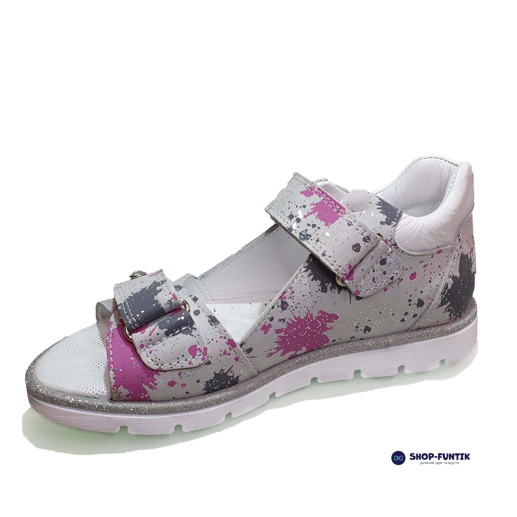 Если ваш ребёнок обожает рисовать и не любит это скрывать или просто является творческой личностью — представленная на этой странице модель точно придется ему по душе. Сандалии для девочек от турецкого производителя Panda обладают необычным принтом в виде брызг от краски, которые изысканно выделяются на фоне основного серого оттенка.