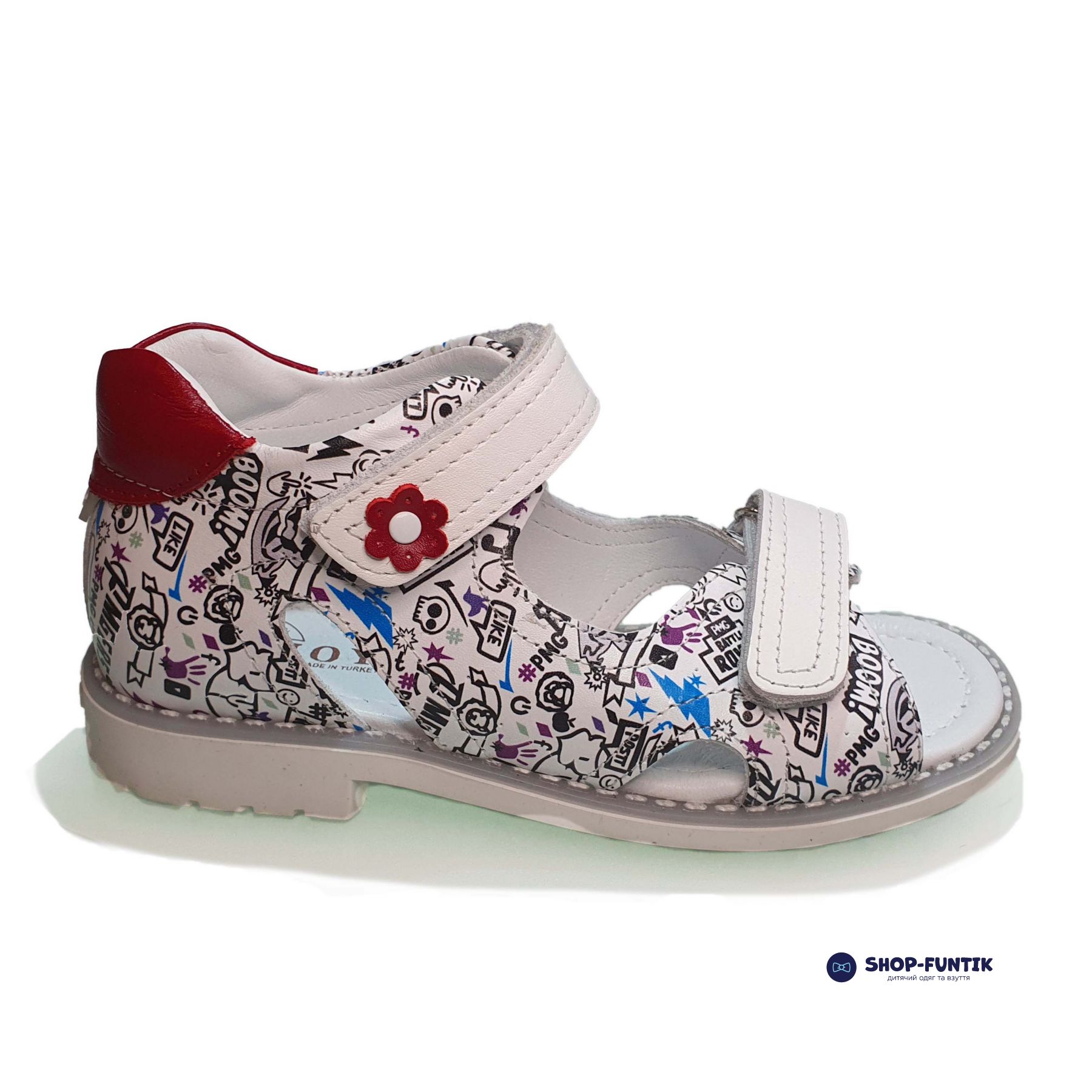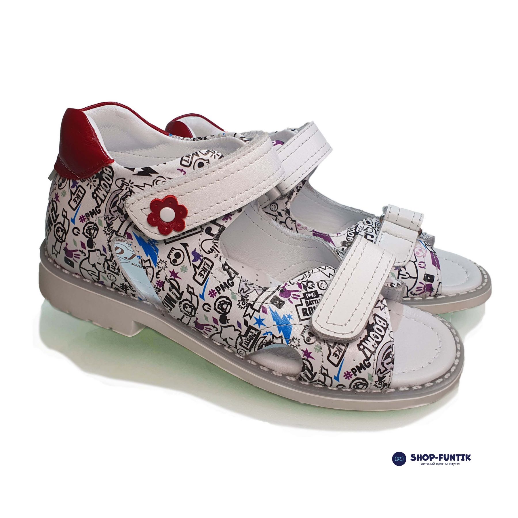 Стильный, современный мультяшный принт – это то, что отличает эти сандалии Djoy от других моделей. Основной белый цвет в комбинации с детализированным принтом различных популярных персонажей привлекает внимание окружающих и очень нравится ребенку. На застежке – липучке есть дополнительное декорирование в виде красного цветочка, который дополнительно подчеркивает уникальный дизайн модели. Среди других особенностей обязательно стоит выделить: