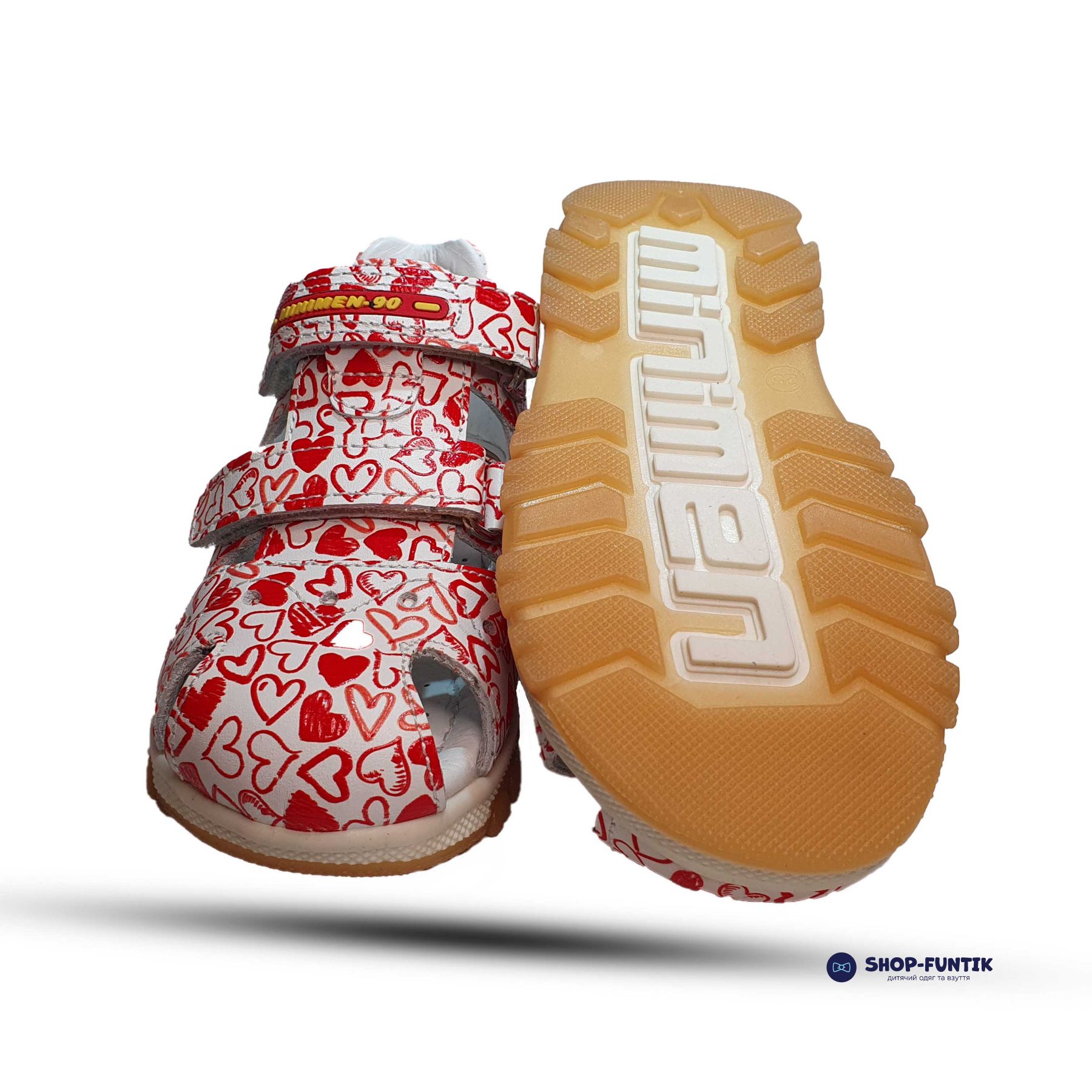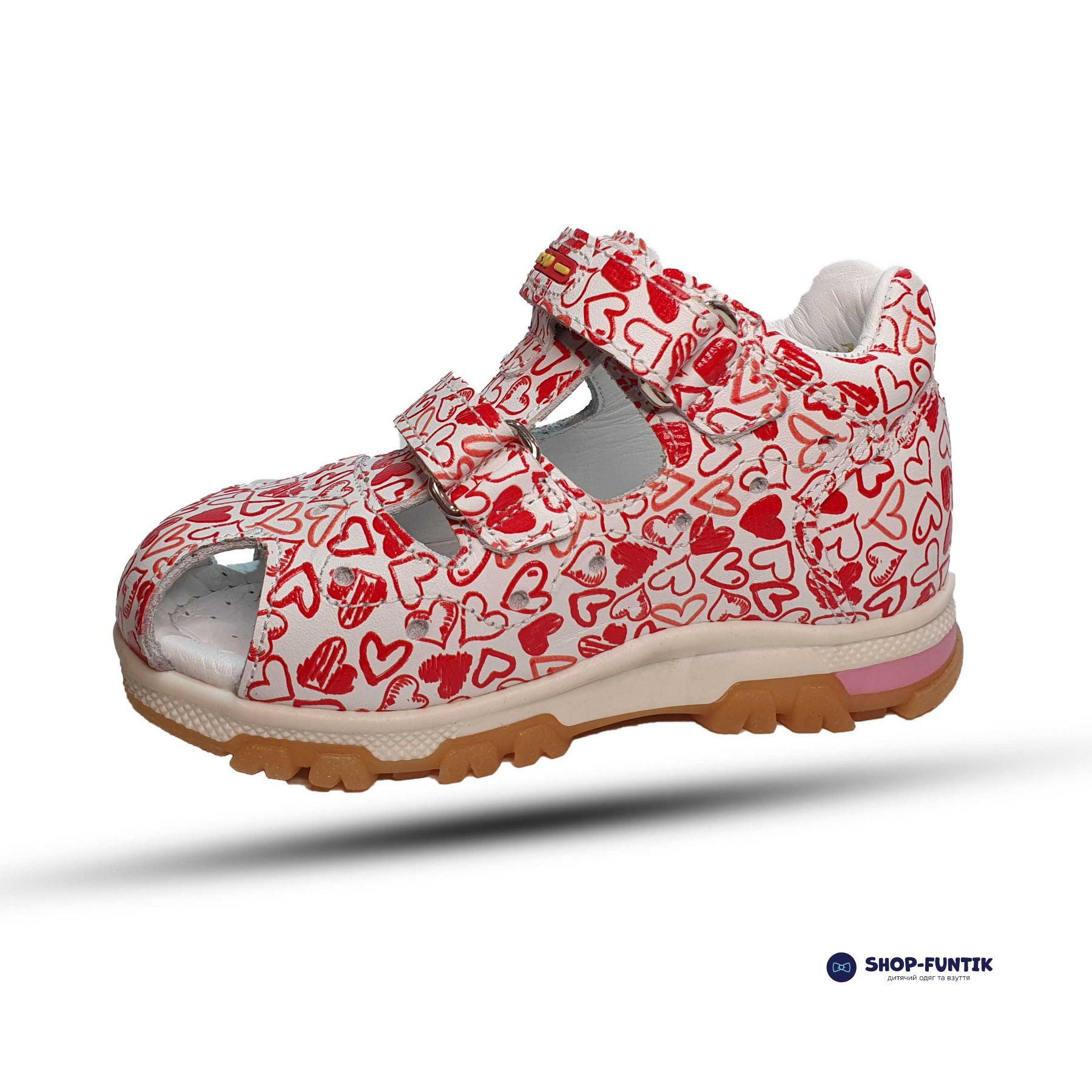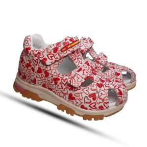 Ремешки изготовлены из натуральной кожи белого цвета. Красный принт привлекает внимание, поэтому у вас не будет проблем с надеванием. Кожа хорошо поддерживает ножку, обеспечивая анатомически правильную ходьбу.