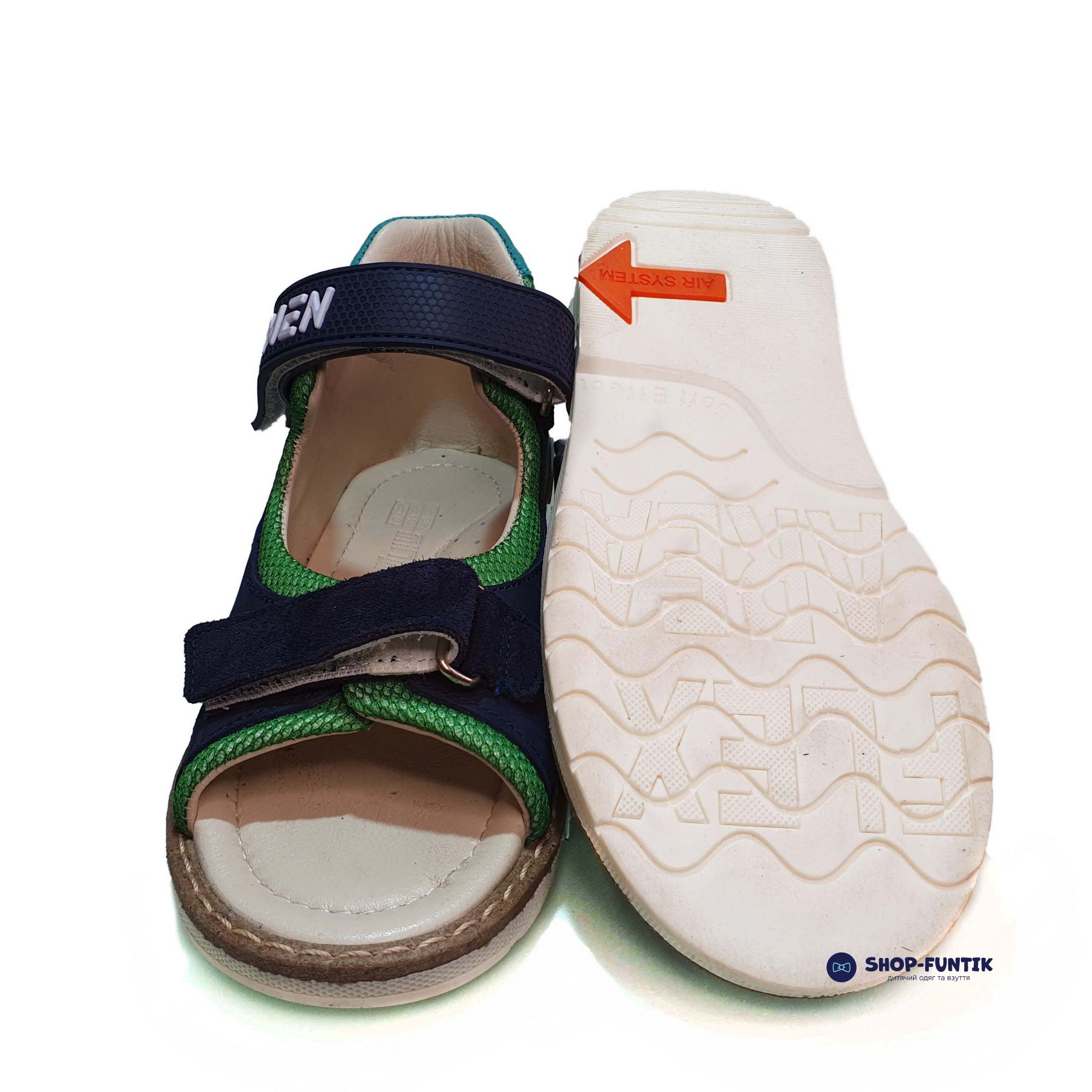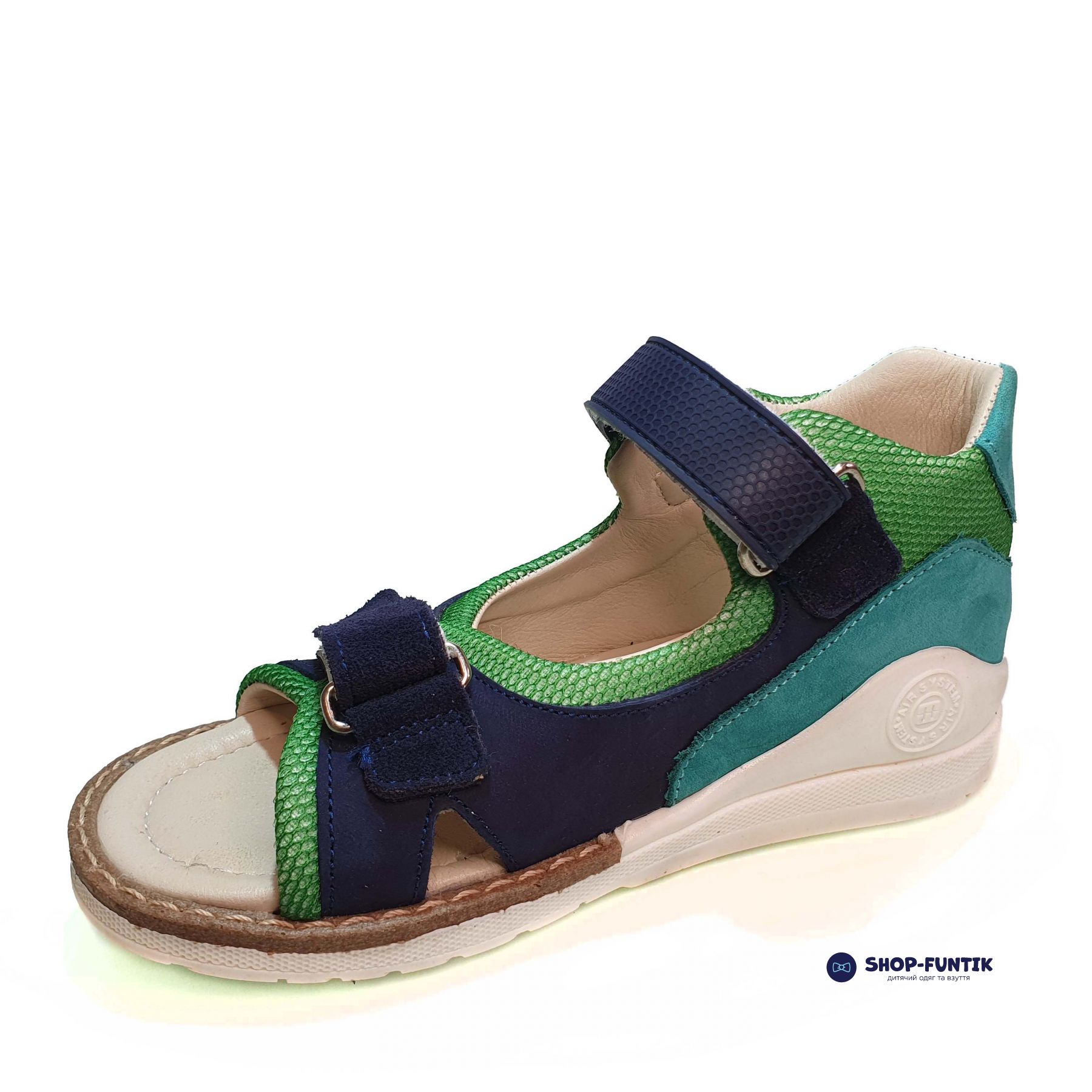 Верх сандалий выполнен из высококачественного нубука, что придает обуви элегантный и прочный вид. Открытый носок обеспечивает отличную вентиляцию, позволяя ногам дышать и оставаясь прохладными в жаркие дни. Жесткий задник предоставляет дополнительную поддержку и стабильность, что важно для правильного формирования детской стопы.