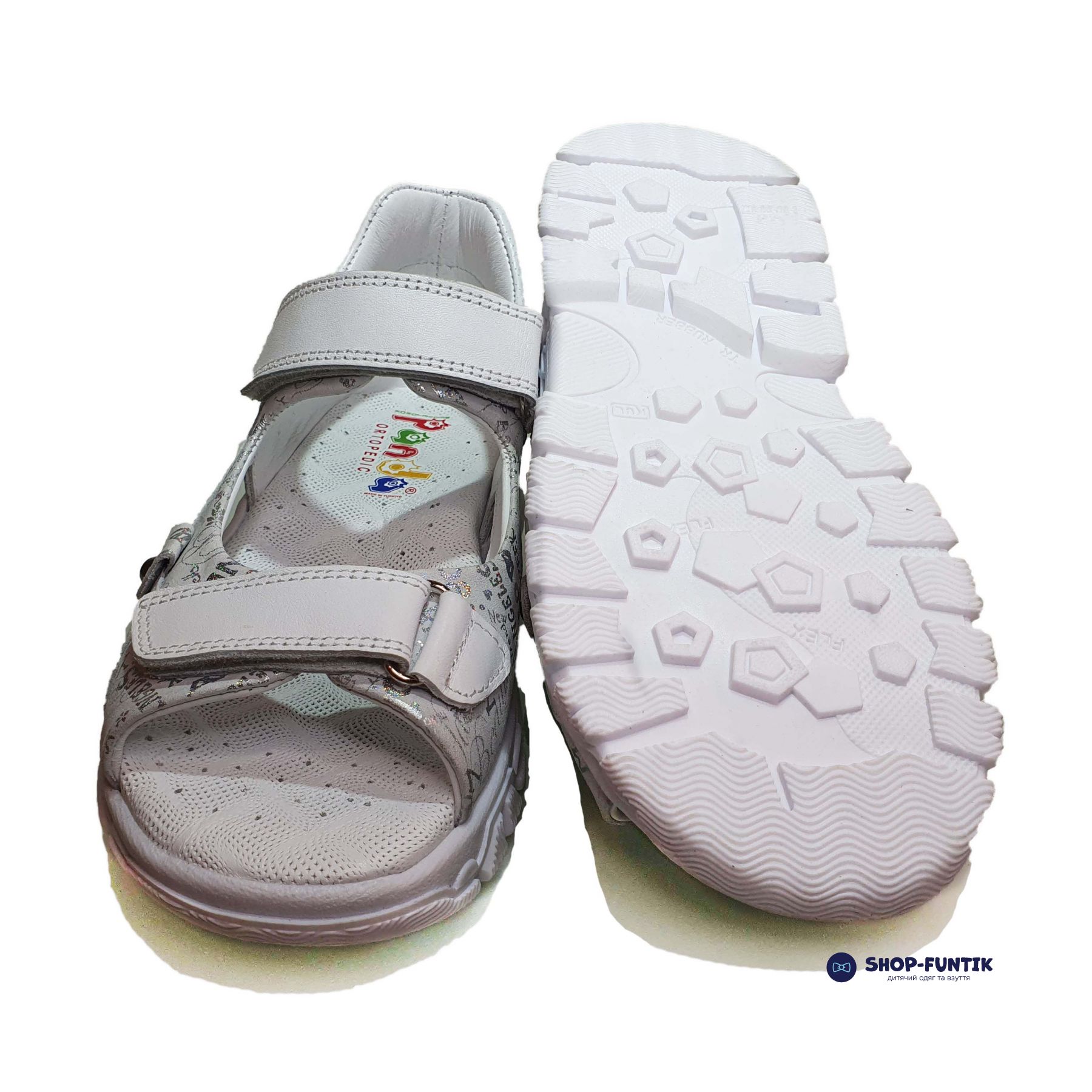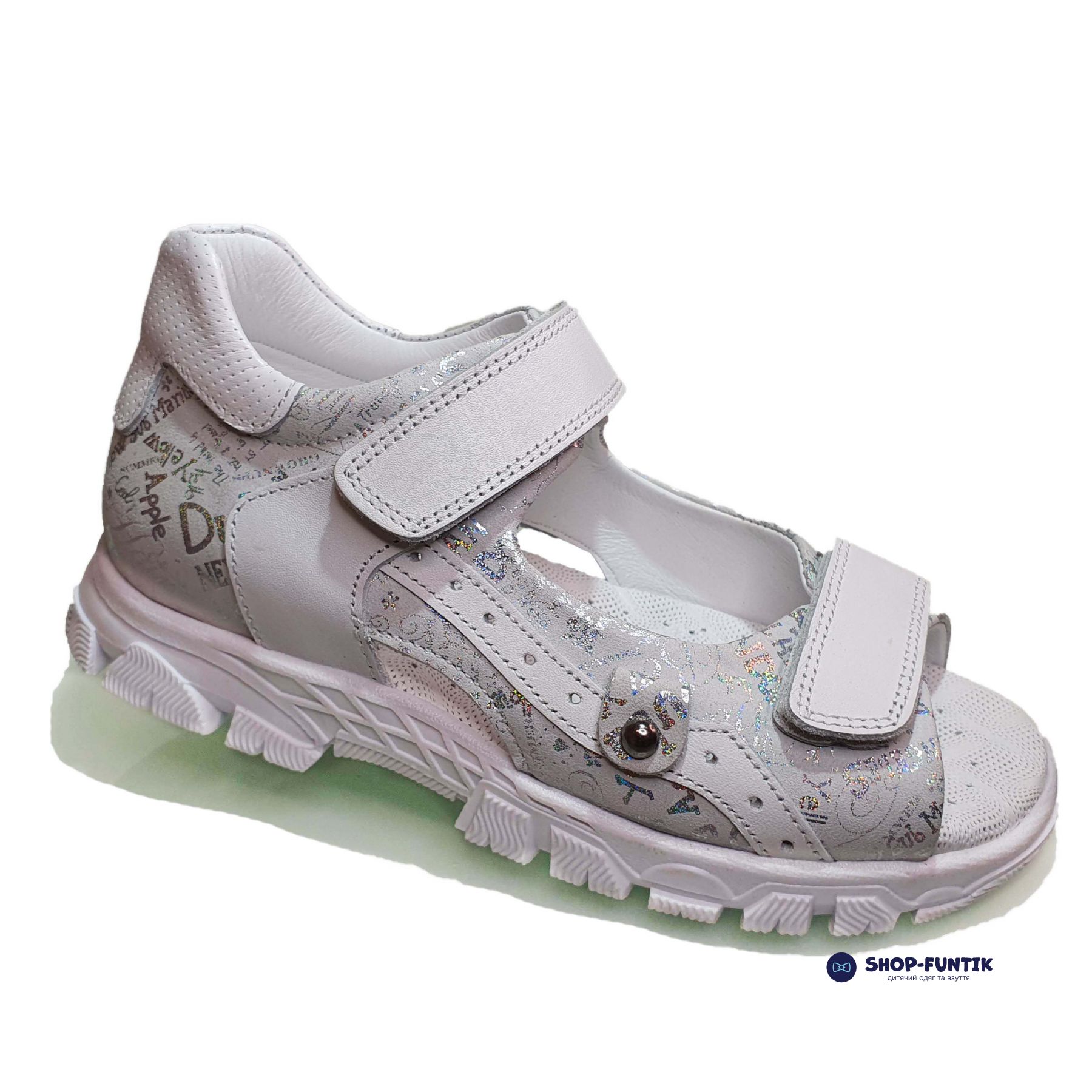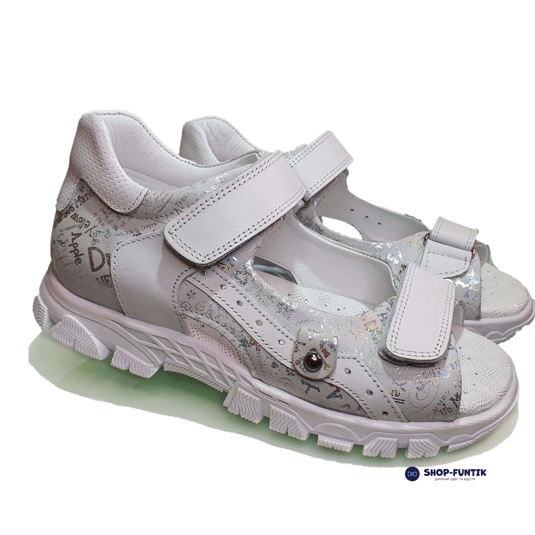 Сандалии детские для девочек изготавливаются в Турции. Минималистический дизайн в стиле газетных вырезок позволяет носить обувь как каждый день, так и на разные мероприятия. Вся модель сделана из натуральной кожи. Декоративные элементы в виде аппликации хорошо прошиты, не отвалятся во время прогулки или активных игр.