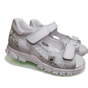 Идеальная пара детские сандалии на лето — серебристый цвет, открытый фасон, натуральные, полностью безопасные, материалы способствуют комфорту в самую жаркую погоду. Подходят для ношения в сухое время года, так как «дышат» при помощи правильно разработанной перфорации. Поддерживают пятку, чтобы ребёнок не травмировался во время ходьбы из-за скольжения.