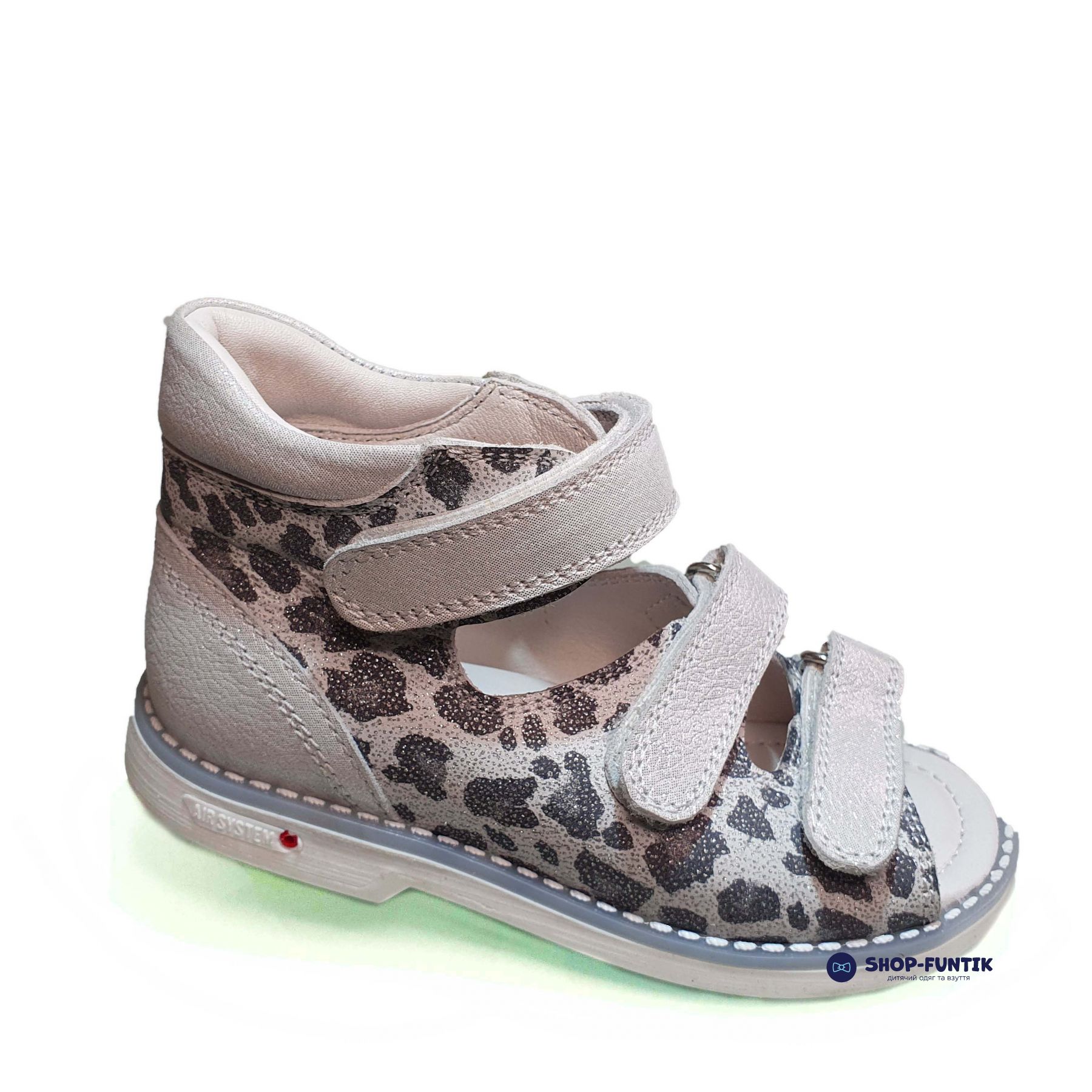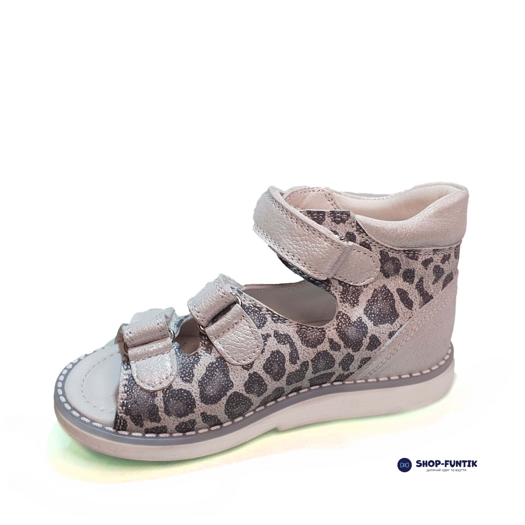 Верх сандалий выполнен из высококачественной натуральной кожи светло-серого цвета с анималистическим принтом, что придаёт обуви модный и привлекательный вид. Анималистический принт добавляет игривый и стильный акцент, делая сандалии привлекательными для юных модниц.
