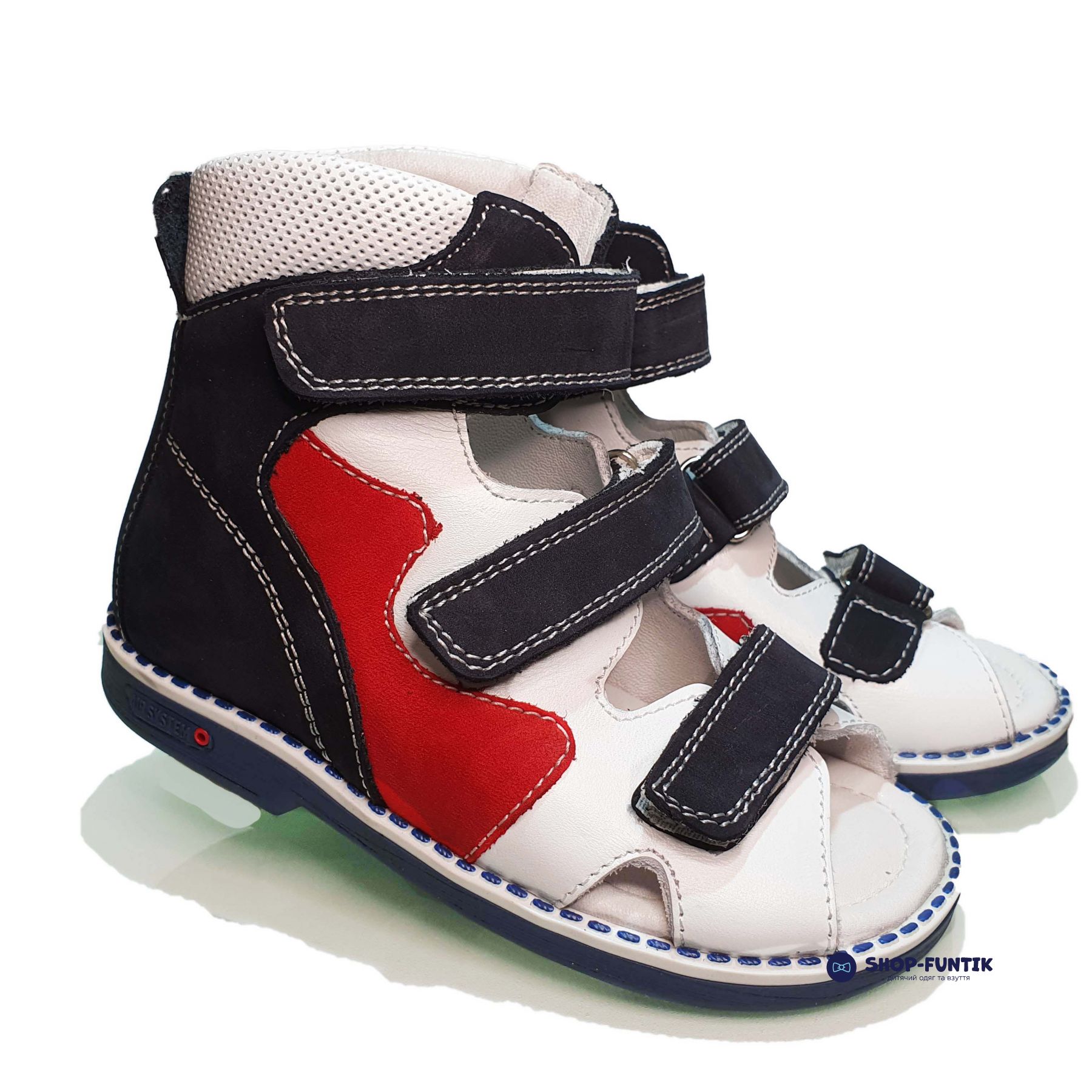 Мягкий валик по краям верха предотвратит натирание кожи ног. Открытый носок обеспечит хорошую вентиляцию во время летней прогулки в жару. Три застежки липучки отрегулируют полноту под размер ноги и надежно зафиксируют ножку. Бело синие сандалии украшены волнистой аппликацией красного цвета.