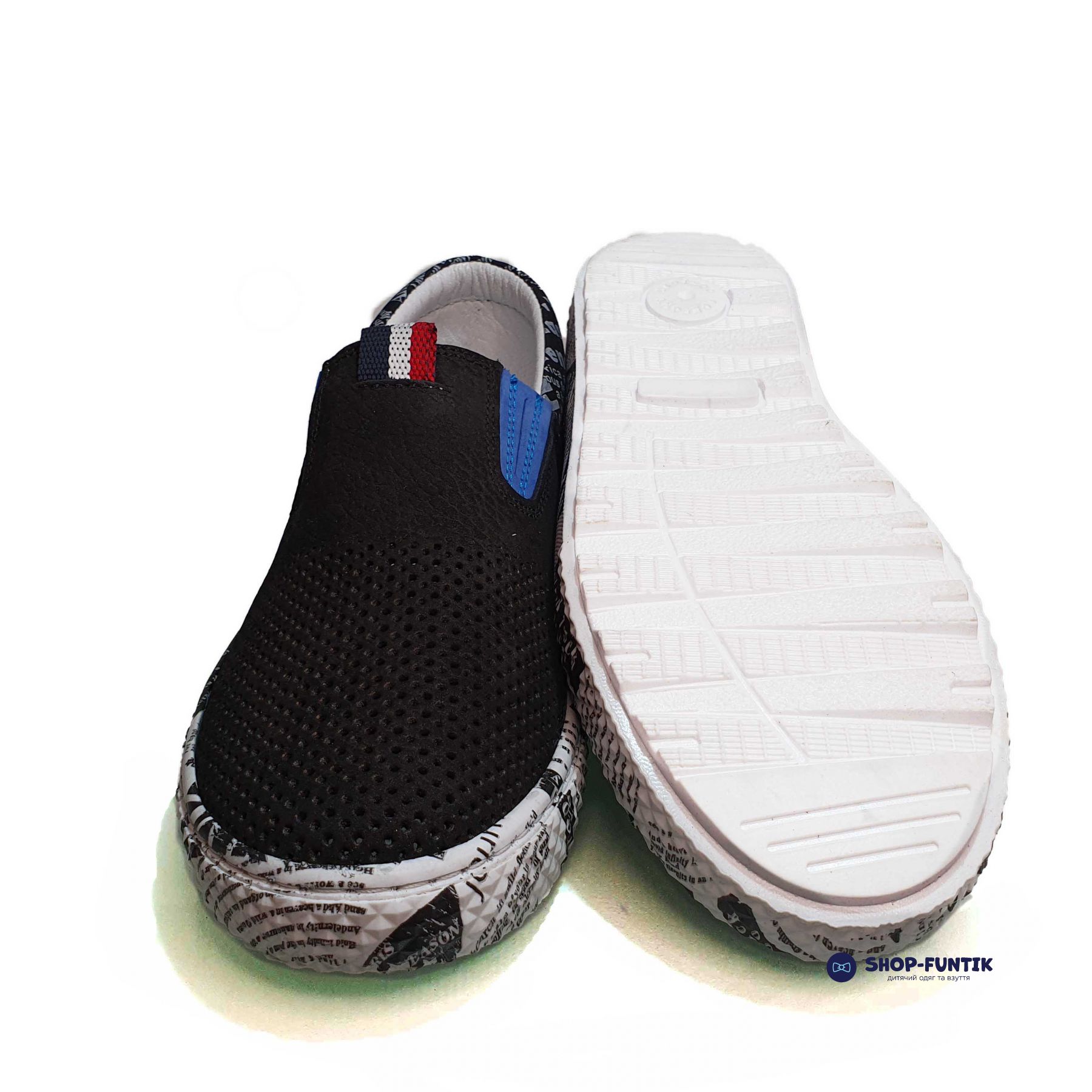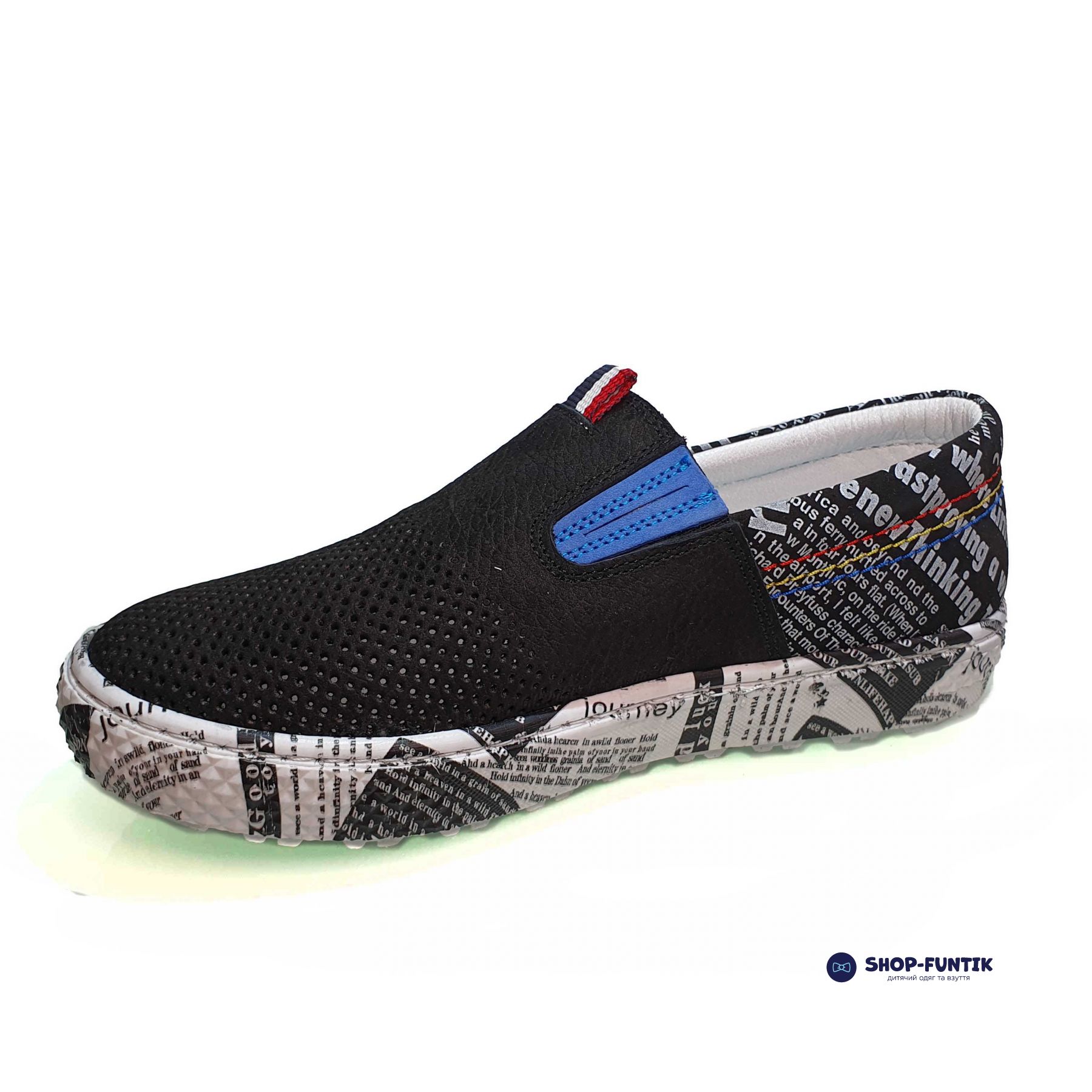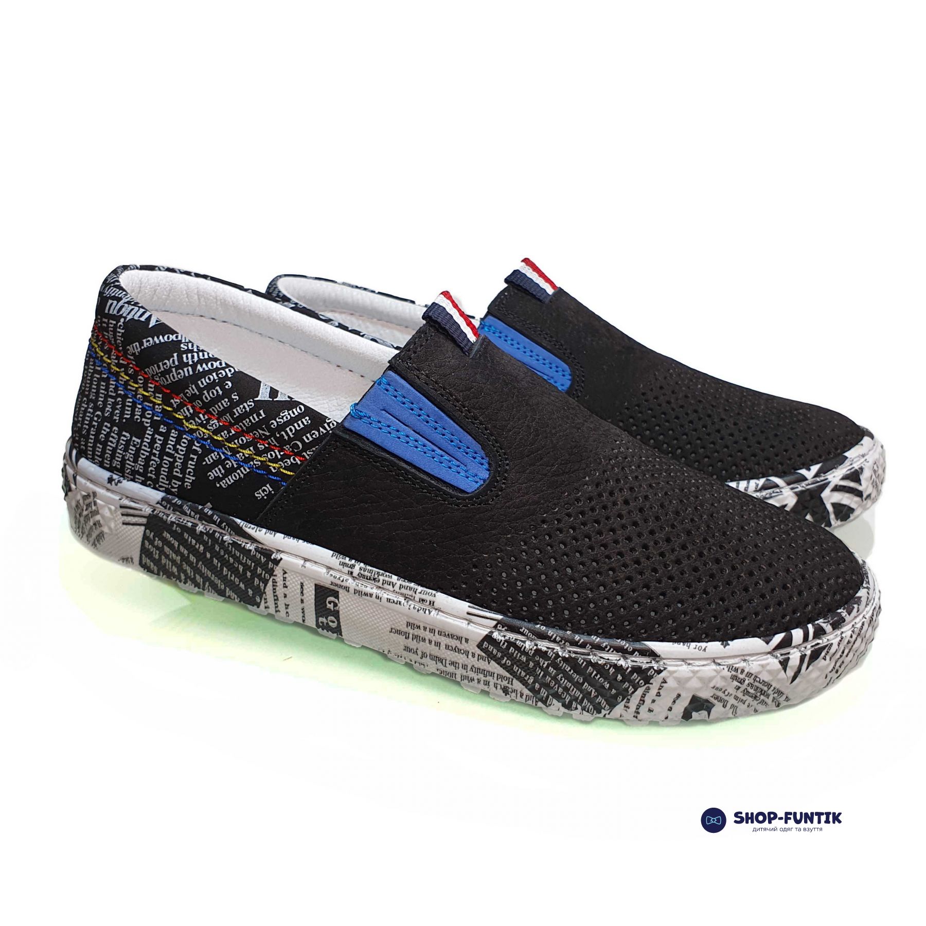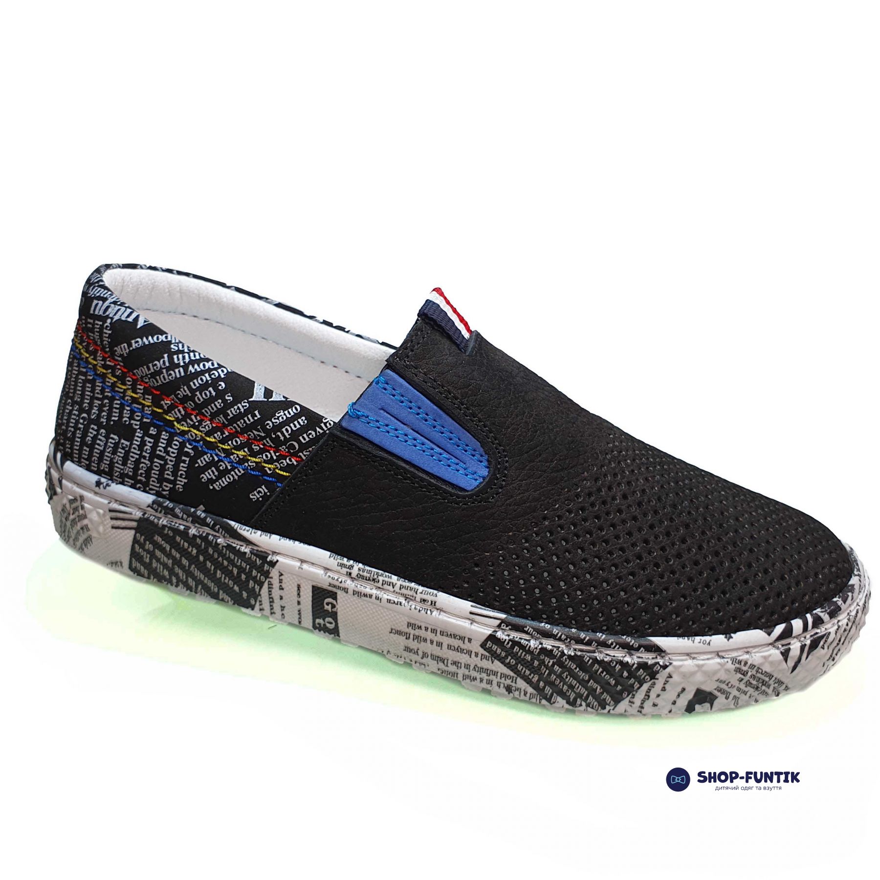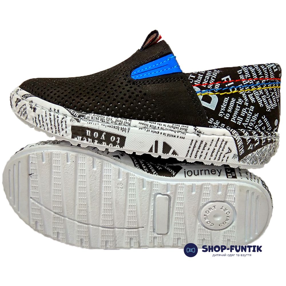 Слипоны Tomini черные с газетным принтом 2028