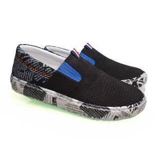 Застежка в виде резинки выполнена в синем цвете. Принт нанесен на заднюю часть обуви и на