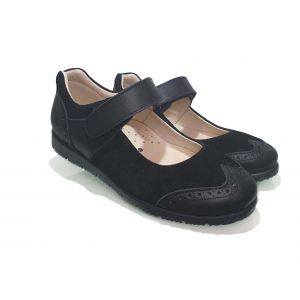 Турецкий производитель обуви Minicolor разрабатывает удобные и практичные модели, предназначенные для продолжительного ношения в течение дня. Черные туфли для девочек из нубука подойдут в качестве школьной сменки или для улицы в теплое время года. Модель декорирована кожаными вставками оригинальной формы на мыске, пятке и ремешке.