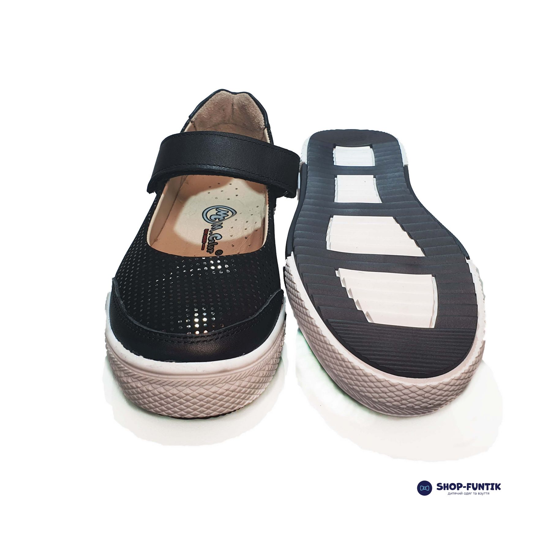 Модные туфли для девочек Турецкого производителя Minicolor подходят для ежедневного ношения на улице в теплое время года или в качестве сменной обуви в школе. Модель выполнена из кожи с аппликацией. На мыске, пятке и застежках черные однотонные вставки. Подошва из поливинилхлорида белого цвета отличается высокой прочностью и упругостью.