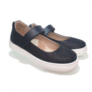 Модные темно-синие туфли для девочек турецкого производства Minicolor предназначены для повседневного ношения в школе или на улице. Модель выполнена из натуральной кожи, имеет сквозную перфорацию и гладкие вставки на мыске, пятке и застежке. Белая толстая спортивная подошва из полиуретана обеспечивает легкость туфель и позволяет активно двигаться их обладательнице.