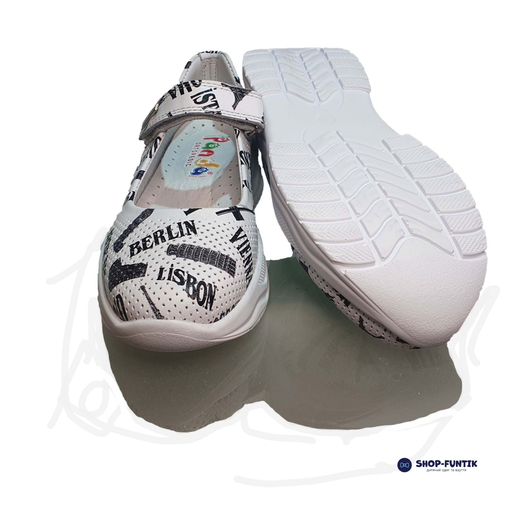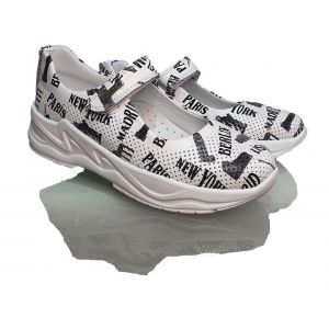 Модель сделана в белом цвете. Есть ненавязчивый принт черного цвета в виде известных памяток архитектуры и названий городов. Подходят под классический черно-белый школьный дресс-код и отлично сочетаются с гардеробом любых цветов.
