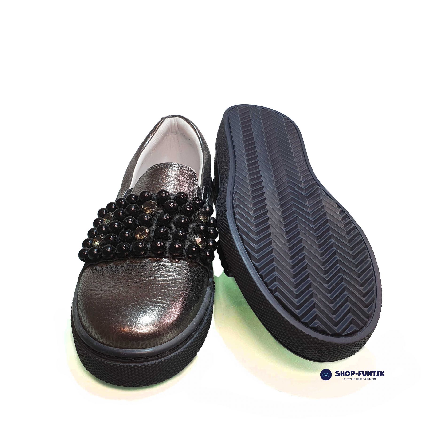 Верх туфель выполнен из высококачественной натуральной кожи, обеспечивая долговечность и комфорт. Туфли украшены широкой полоской, усыпанной декоративными камушками, которые придают обуви нарядный и стильный вид. Эти блестящие элементы добавляют изюминку в дизайн, делая туфли привлекательными и модными для юных модниц.