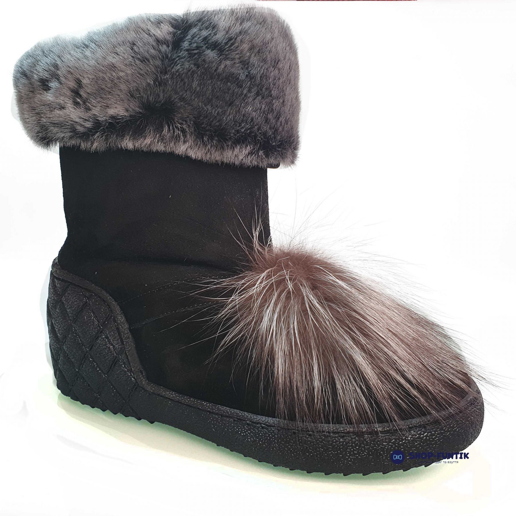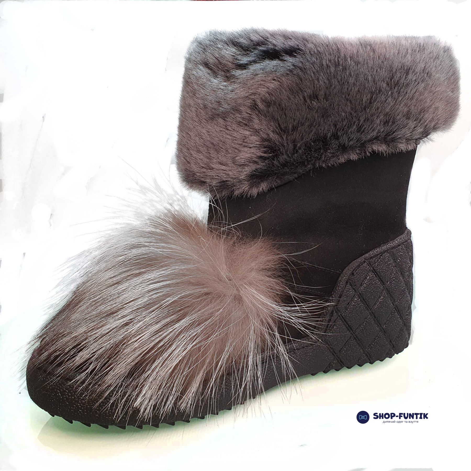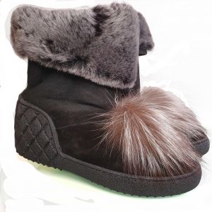 Детские угги украшены натуральным мехом черного цвета. Застежки нет, зимнюю подростковую