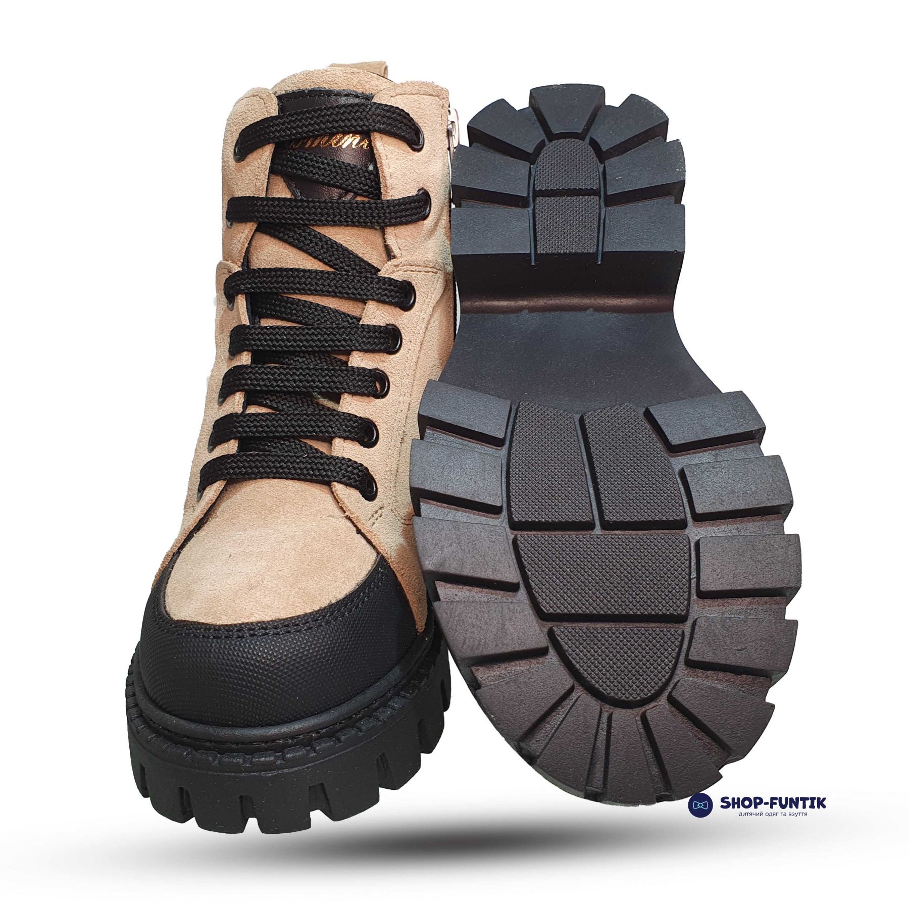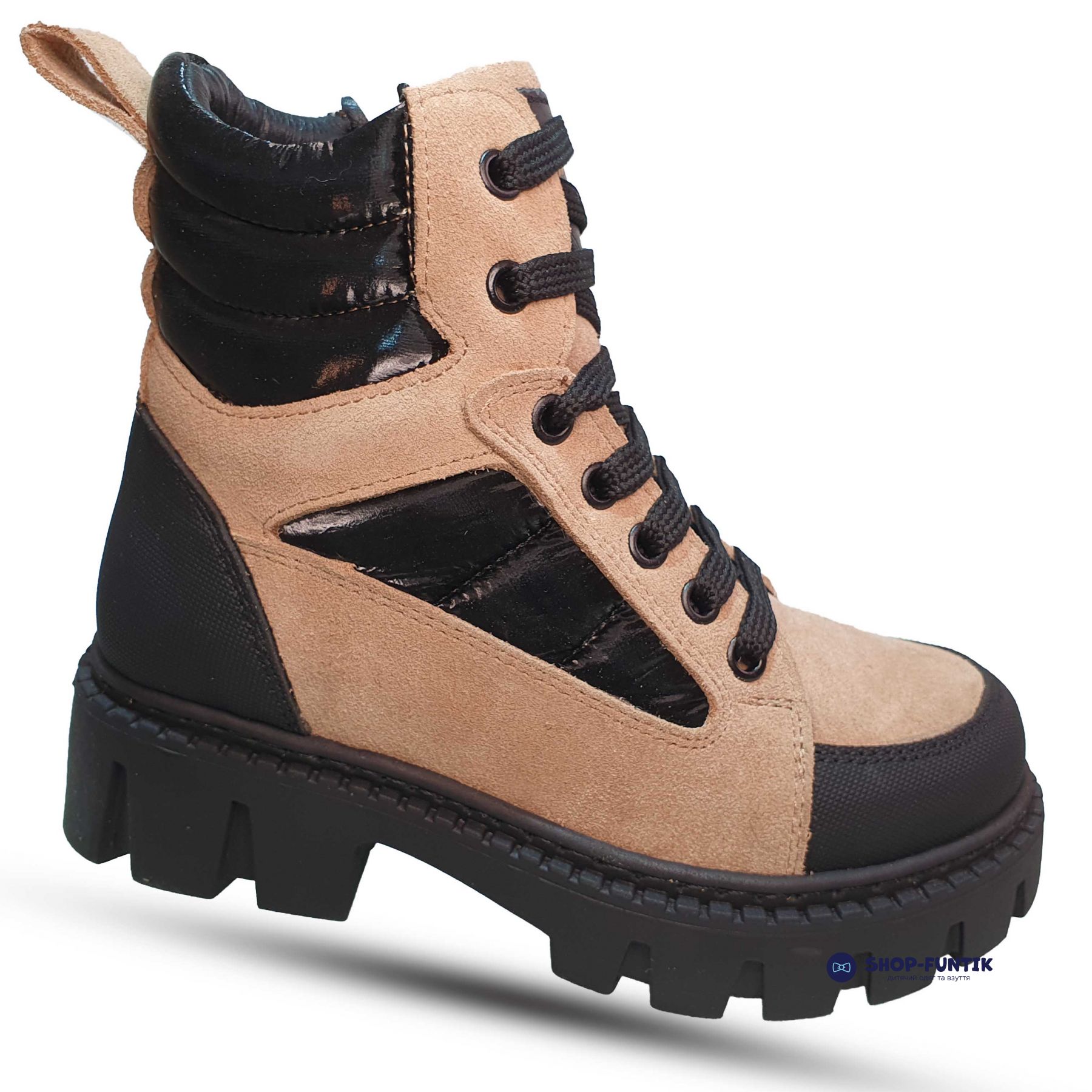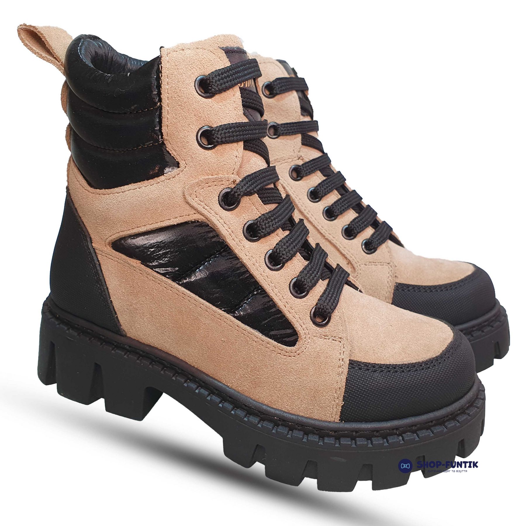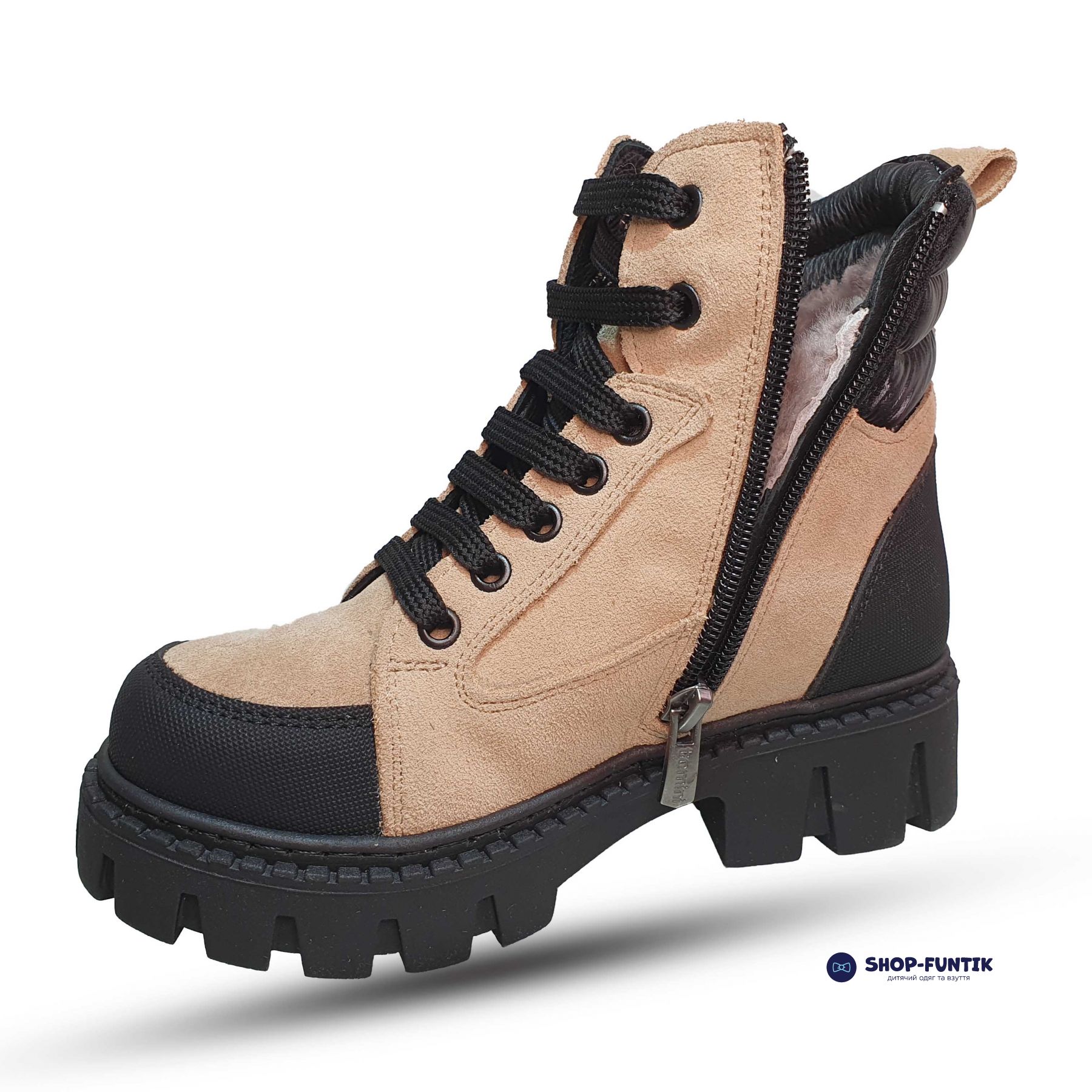 Дизайн та конструкція: Черевики виконані у вишуканому чорно-бежевому кольорі з елементами декору чорного кольору, що додає взуття сучасного та модного вигляду. Декоративна шнурівка спереду підкреслює стильний дизайн, а застібка блискавка з боків дозволяє легко вдягати та знімати взуття. Висока чорна підошва забезпечує надійне зчеплення з різними поверхнями та захист від холоду.