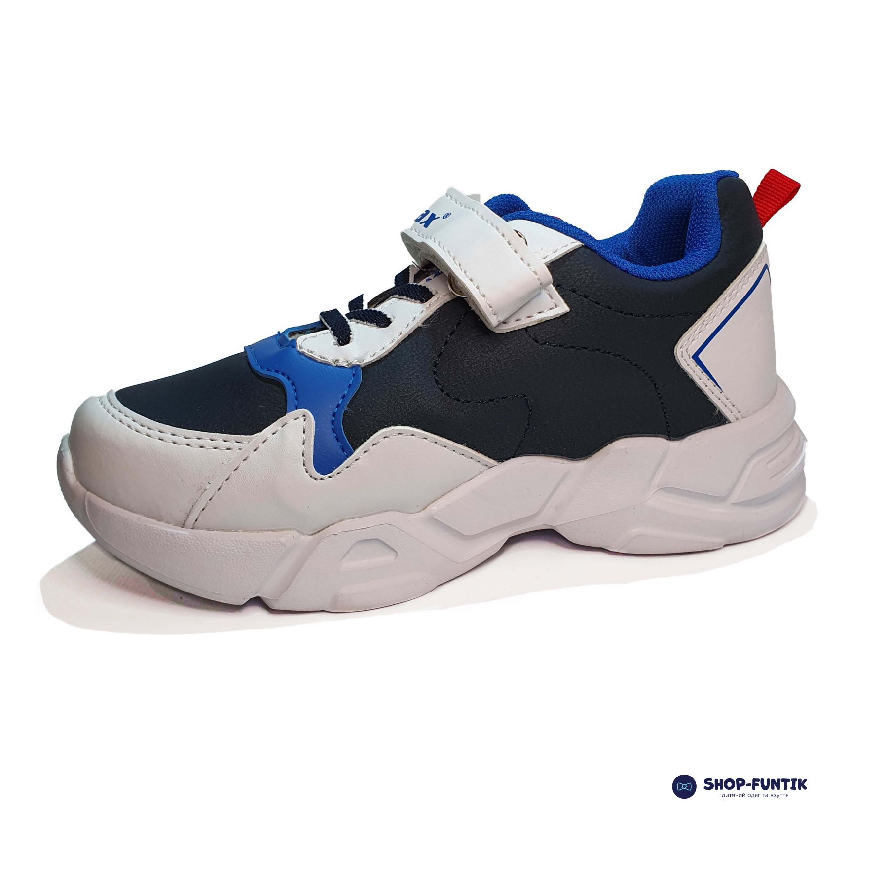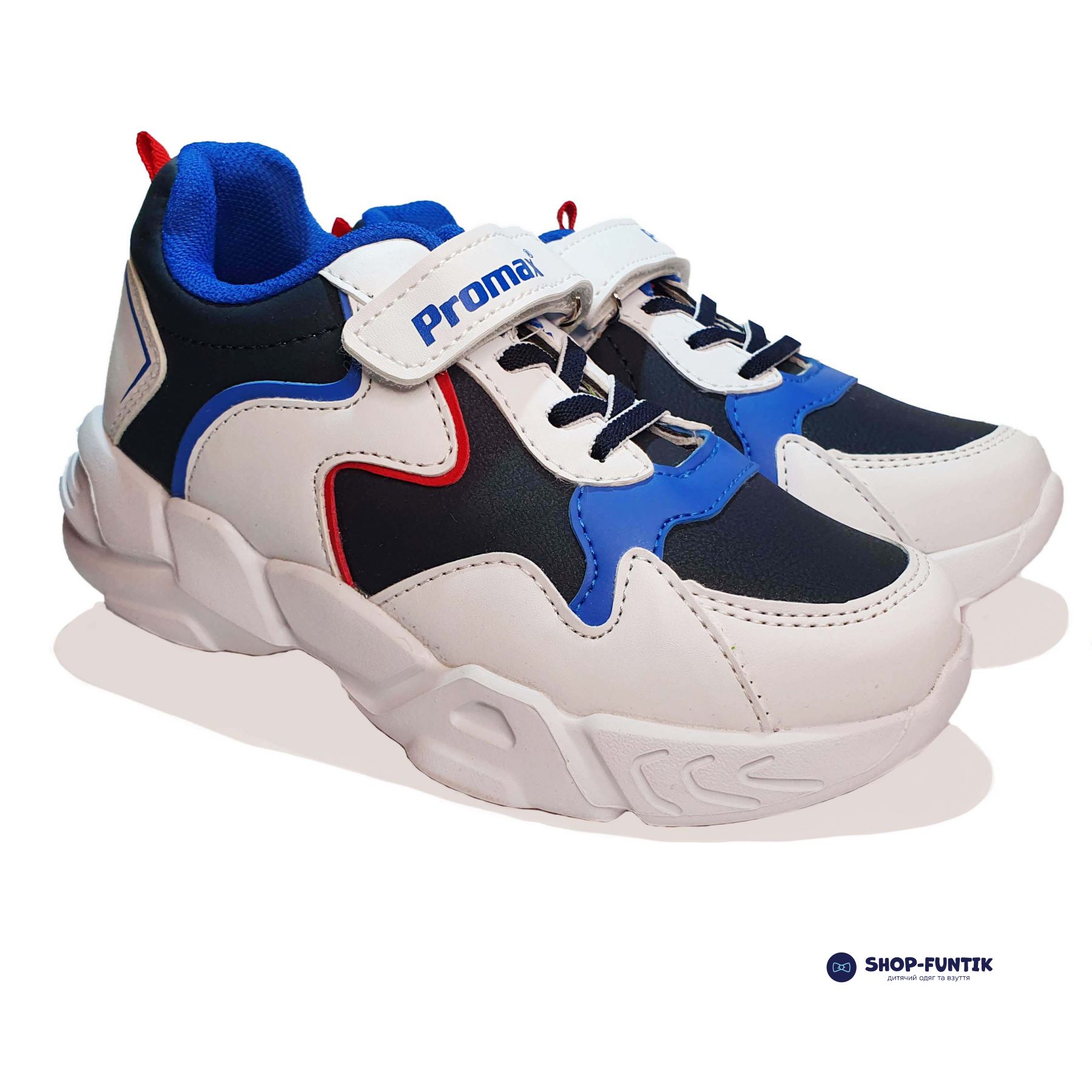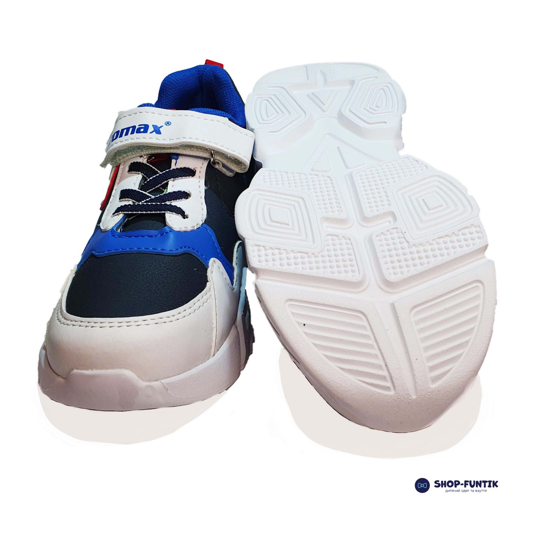 Дизайн спортивного дитячого взуття класичний. Основні кольори синій, червоний, білий та