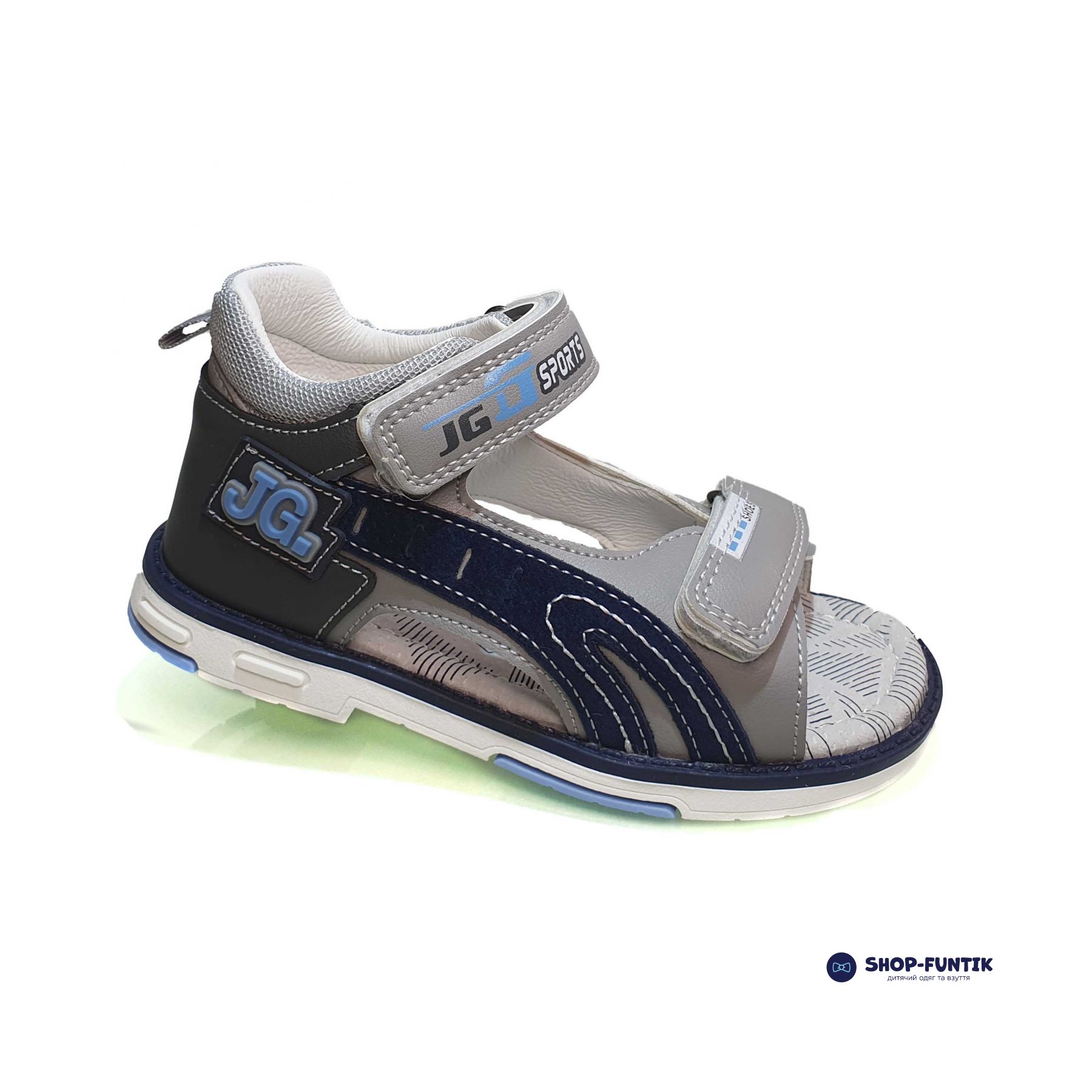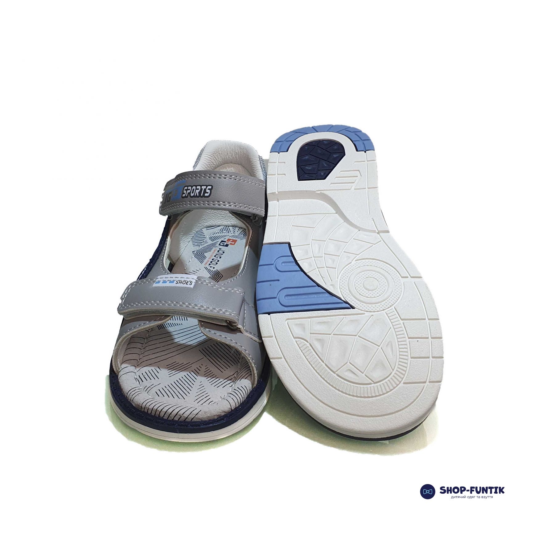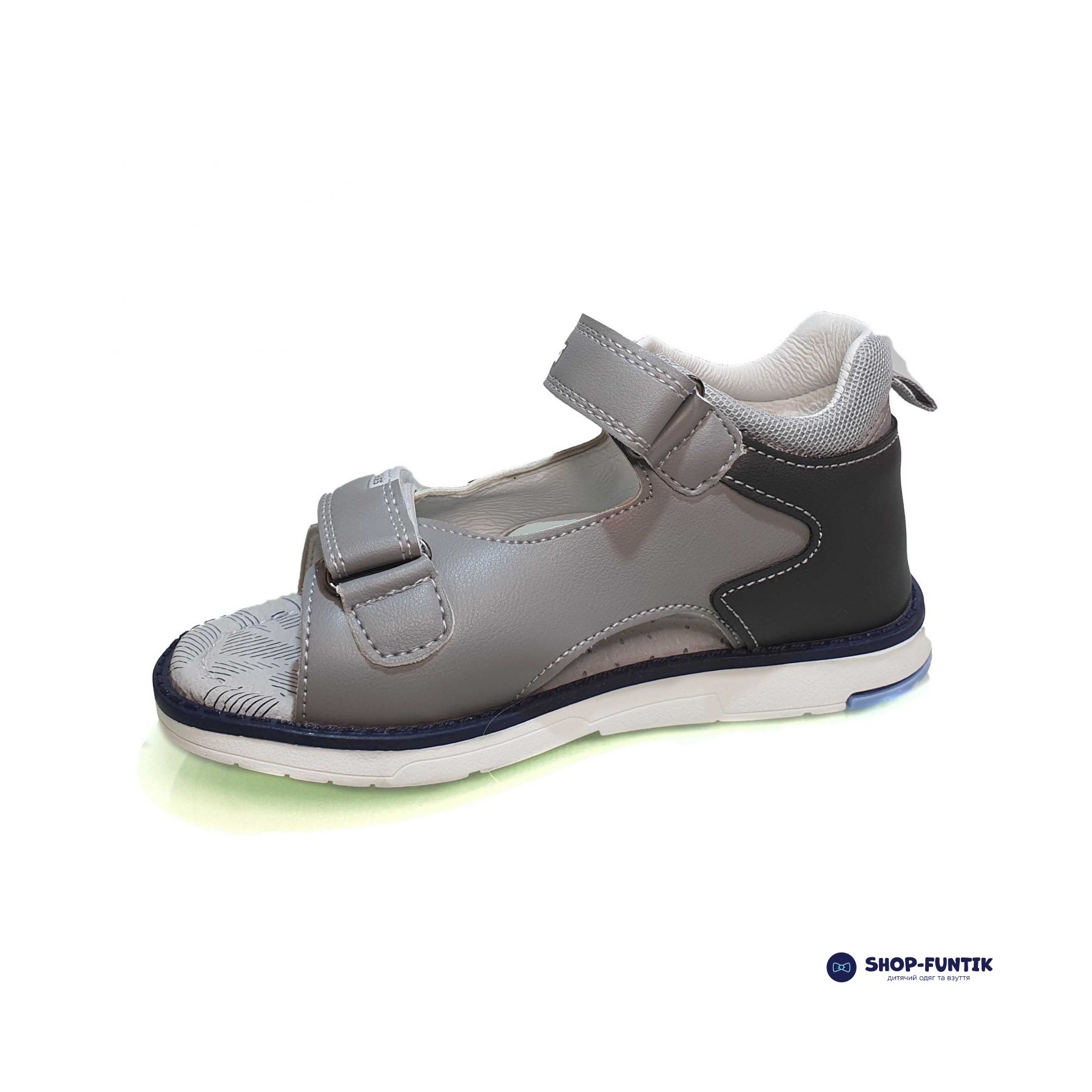 Верхня частина сандаль виготовлена з якісної екошкіри світло-сірого кольору з елегантними темно-синіми вставками, що надає взуттю сучасного та привабливого вигляду.